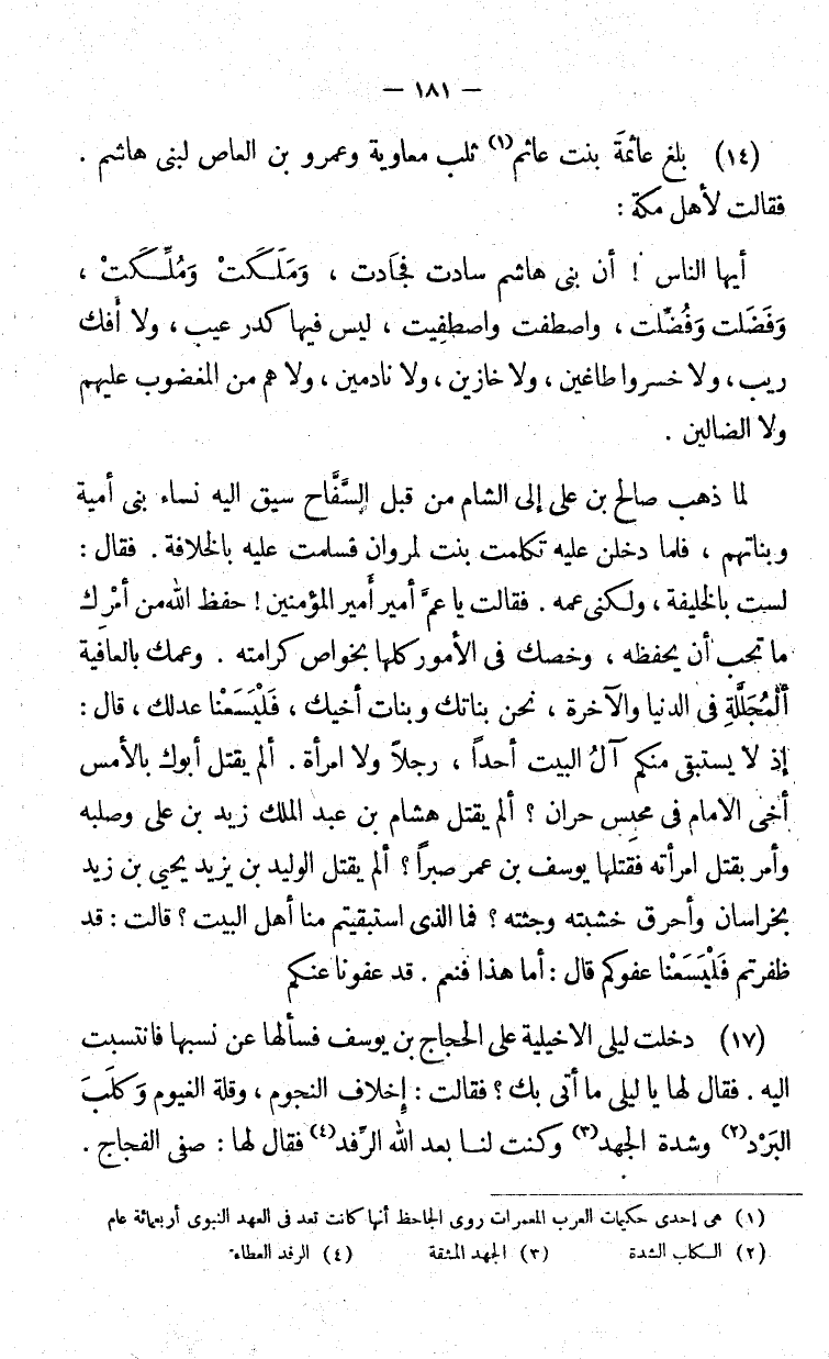 لما ذهب صالح بن علي إلى الشام من قبل السفاح سيق إليه بني أمية وبناتهم، فلما دخل عليه تكلمت بنت لمروان فسلمت عليه بالخلافة. فقال: لست بالخليفة؛ ولكني عمه. فقالت يا عم أمير المؤمنين! حفظ الله من أمرك ما تحب أن يحفظه، وخصك في الأمور كلها بخواص كرامته. وعمك بالعافية المَجَللة في الدنيا والآخرة، نحن بناتك وبنات أخيك، فلْيَسَعْنا عدلك، فقال: إذاً لا يستبقي منكم آل البيت أحداً، رجلا ولا امرأة. ألم يقتل أبوك بالأمس أخي الإمام في محس حران؟ ألم يقتل هشام بن عبد الملك زيد بن علي وصلبه وأمر بقتل امرأته فقتلها يوسف ابن عمر صبراً؟ ألم يقتل الوليد بن يزيد يحيى بن زيد بخراسان وأحرق خشبته وجثته؟ فما الذي استبقيتم منا أهل البيت؟ قالت: قد ظفرتم فَلْيَسَعْنا عفوكم قال: أمّا هذا فنعم قد عفونا عنكم.