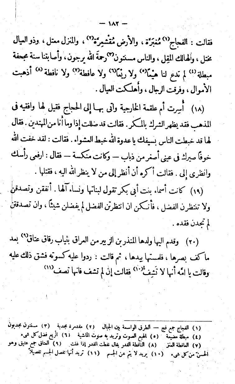 أُسرت أم علقمة الخارجية وأتي بها إلى الحجاج فقيل لها وافقيه في المذهب فقد يظهر الشرك بالمكر. فقالت قد ضللت إذاً وما أنا من المهتدين. فقال لها قد خطبت الناس بسيفك يا عدوة الله خبط العشواء. فقالت خفت الله خوفاً صيرك في عيني أصغر من ذباب - وكانت منكسة - فقال: ارفعي رأسك وانظري إلى. فقالت أكره أن أنظر غلى من لا ينظر الله إليه، فقتلها.
