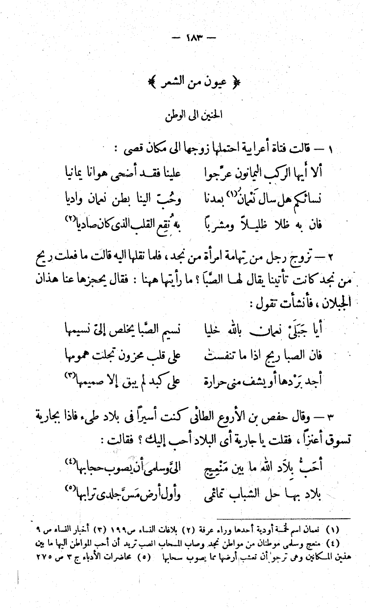 وقال حفص بن الأروع الطائي كنت أسيرا في بلاد طيء فإذا بجارية تسوق أعنزا، فقلت يا جارية أي البلاد أحب إليك؟ فقالت: