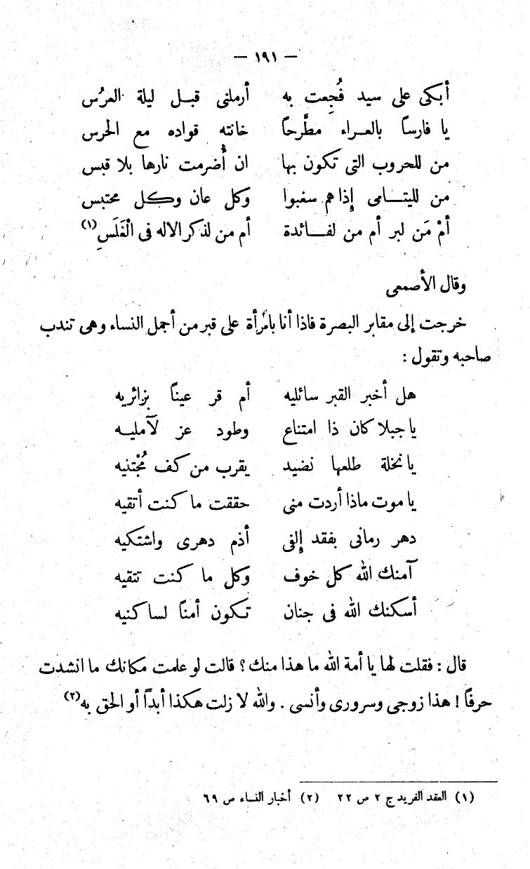 خرجت إلى مقابر البصرة فإذا أنا بامرأة على قبر من أجمل النساء وهي تندب صاحبه وتقول:
