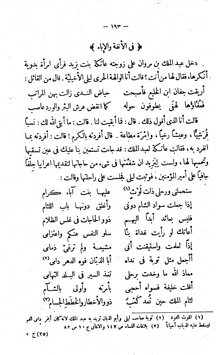 قالت أنا الذي أقول ذلك. قال: فما أبقيت لنا. قالت: ما أبقي الله لك؛ نسباً قُريشياَّ وعيشاً رخيا، وإمرة مطاعة. قال أفردته بالكرم! قالت: أفردته بما انفرد به فقالت عاتكة لعبد الملك: قد جاءت تستعين بنا عليك في عين تسقيها وتحميها لها، ولست لِيَزِيد إنن شفَّعتها من حاجاتها لتقديمها أعرابيا جِلْفاً جافيا على أمير المؤمنين، فوثبت ليلى فجلست على راحلتها وقالت: