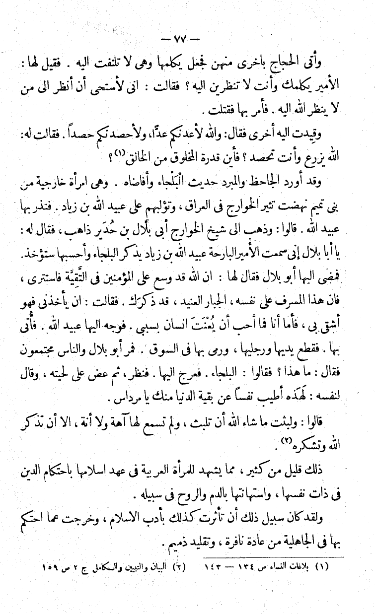 وقد أورد الجاحظ والمبرد حديث البَلْجاء وأفاضاه. وهي امرأة خارجية من بني تميم نهضت تثير الخوارج في العراق، وتؤلبهم على عبيد الله بن زياد. فنذر بها