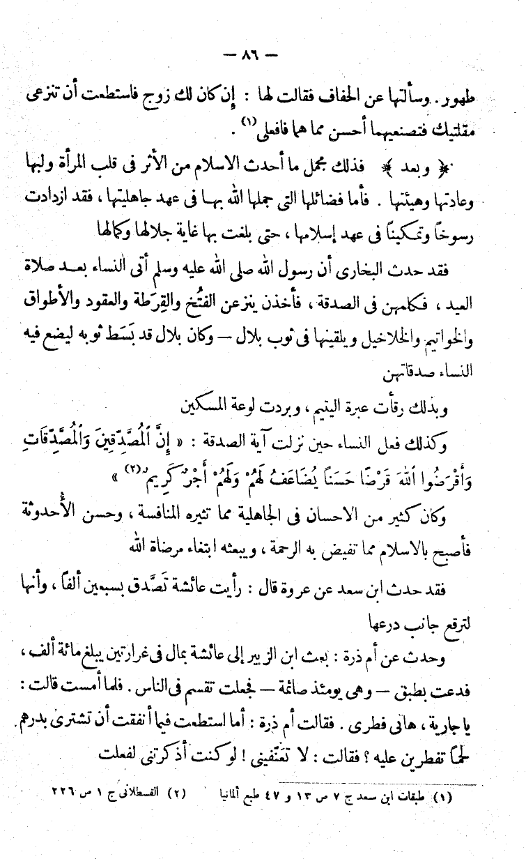 وكذلك فعل النساء حين نزلت آية الصدقة: (إنَّ المُصَّدّقِين والمُصّدّقاَتِ وأْقَرضُوا اللهَ قرْضاً حَسَناً يُضَاعَفُ لَهمْ ولهم أَجْرٌ كرِيمٌ).