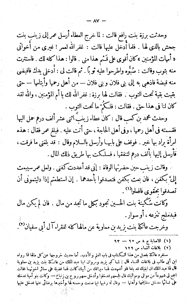 وحدثت برزة بنت رافع: لما خرج العطاء أرسل عمر إلى زينب بنت جحش بالذي لها. فلما دخل عليها قالت: غفر الله لعمري! غيري من أخوتي أمهات المؤمنين كان أقوى على قسم هذا مني. قالوا: هذا كله لك فاستترت منه بثوب وقالت: صبوه واطرحوا عليه ثوباً. ثم قالت لي: أدخلي يدك فاقبضي منه قبضة فاذهبي به إلى بني فلان وبني فلان - من أهل رحمها وأيتامها - حتى بقيت بقية تحت