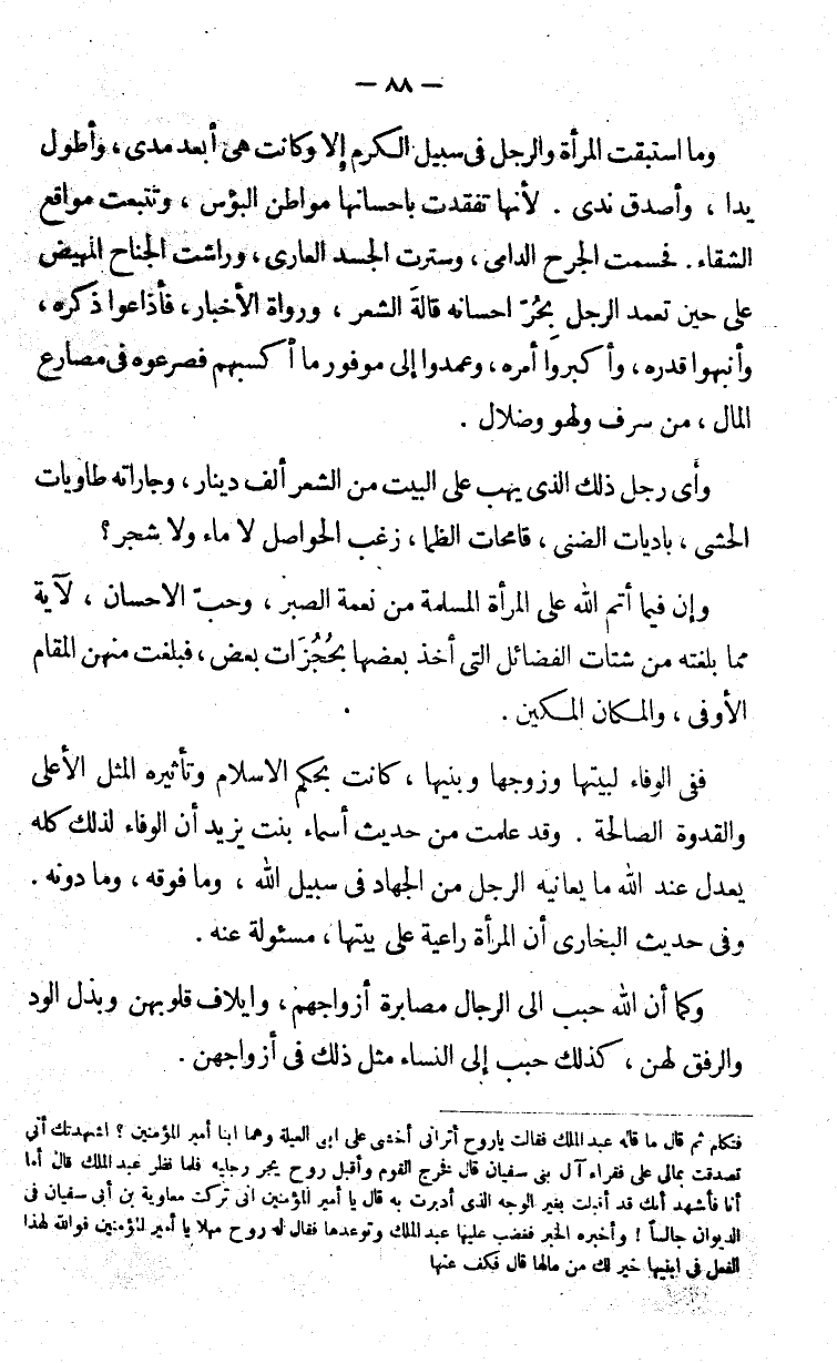 وأي رجل ذلك الذي يهب على البيت من الشعر ألف دينار، وجاراته طاويات الحشى، باديات الضنى، قامحات الظما زغب الحواصل لا ماء ولا شجر؟ وأن فيما أتم الله على المرأة المسلمة من نعمة الصبر، وحبّ الإحسان لآية مما بلغته من شتات الفضائل التي أخذ بعضها بحُجُزات بعض، فبلغت منهن المقام الأوفى، والمكان المكين.