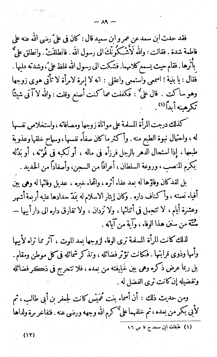 فقد حدّث ابن سعد عن عمرو بن سعيد قال: كان في عليّ رضي الله عنه على فاطمة شدّة. فقالت والله لأشْكُوَنك إلى رسول الله. فانطلقت. وانطلق علي بأثرها. فقام حيث يسمع كلامهما. فشكت إلى رسول الله غلظ عليّ، وشدّته عليها. فقال: يا بنية! اسمعي واستمعي واعقلي: إنه لا إمرة لا تأتي هوى زوجها وهو ساكت. قال عليٌ: فكففت عما كنت أصنع وقلت: والله لا آتي شيئا تكرهينه أبدا.