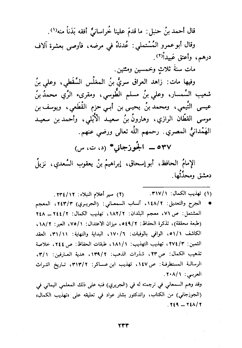 وقد وهم السمعاني في ترجمته له في (الجريري) فنبه على ذلك المعلمي اليماني في (الجوزجاني) من الكتاب، والدكتور بشار عواد في تعليقه على "تهذيب الكمال" 2/ 248 - 249.