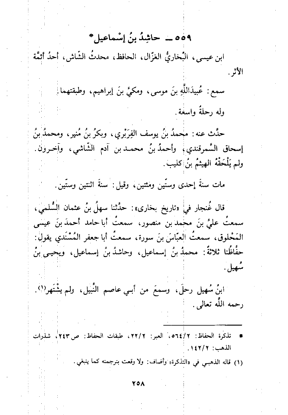 قال غُنجار في "تاريخ بخارى": حدَّثنا سهلُ بنُ عثمان السُّلمي، سمعتُ عليَّ بنَ محمد بن منصور، سمعتُ أبا حامد أحمدَ بنَ عيسى المَحْلوق، سمعتُ العبّاسَ بنَ سورة، سمعت أبا جعفر المُسْنَدي يقول: حفَّاظُنا ثلاثةٌ: محمدُ بنُ إسماعيل، وحاشدُ بنُ إسماعيل، ويحيى بنُ سُهيل.