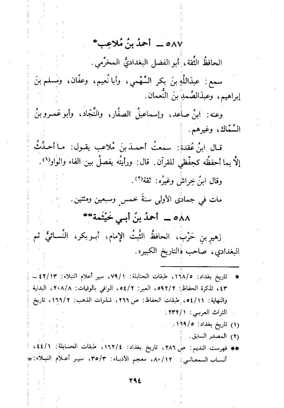 * * فهرست النديم: ص 286، تاريخ بغداد: 4/ 162، طبقات الحنابلة: 1/ 44، أنساب السمعاني: 12/ 80، معجم الأدباء: 3/ 35، سير أعلام النبلاء: =