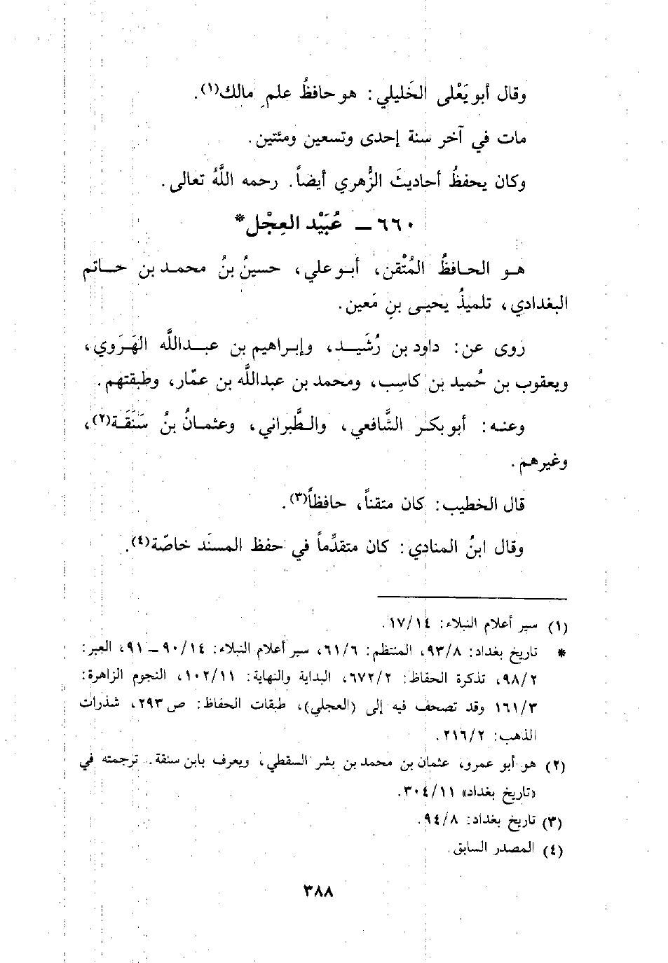 * تاريخ بغداد: 8/ 93، المنتظم: 6/ 61، سير أعلام النبلاء: 14/ 90 - 91، العبر: 2/ 98، تذكرة الحفاظ: 2/ 672، البداية والنهاية: 11/ 102، النجوم الزاهرة: 3/ 161 وقد تصحف فيه إلى (العجلي)، طبقات الحفاظ: ص 293، شذرات الذهب: 2/ 216.