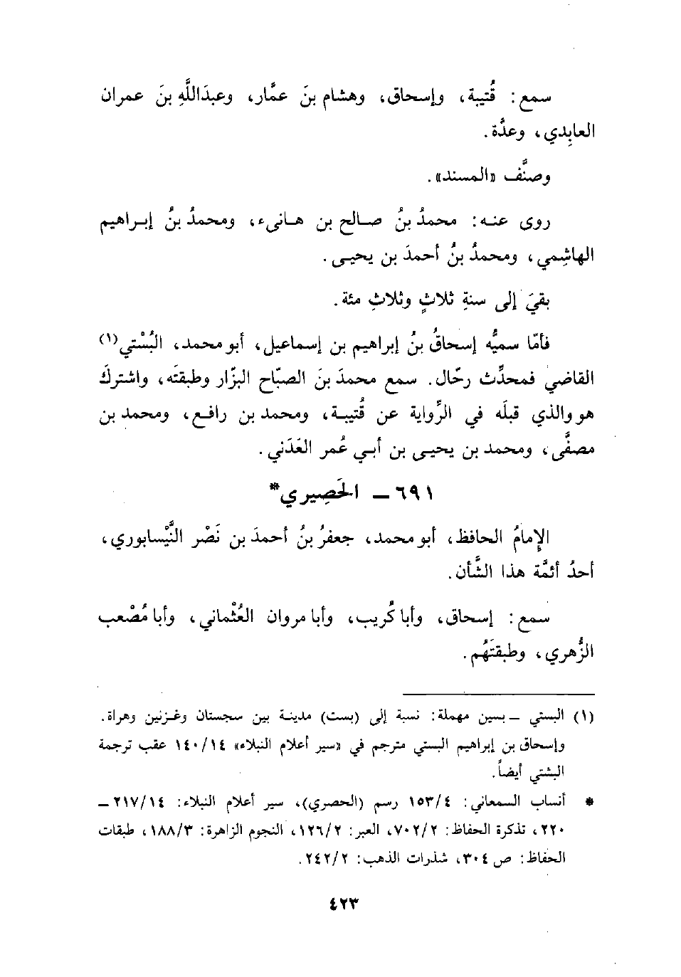 * أنساب السمعاني: 4/ 153 رسم (الحصري)، سير أعلام النبلاء: 14/ 217 - 220، تذكرة الحفاظ: 2/ 702، العبر: 2/ 126، النجوم الزاهرة: 3/ 188، طبقات الحفاظ: ص 304، شذرات الذهب: 2/ 242.