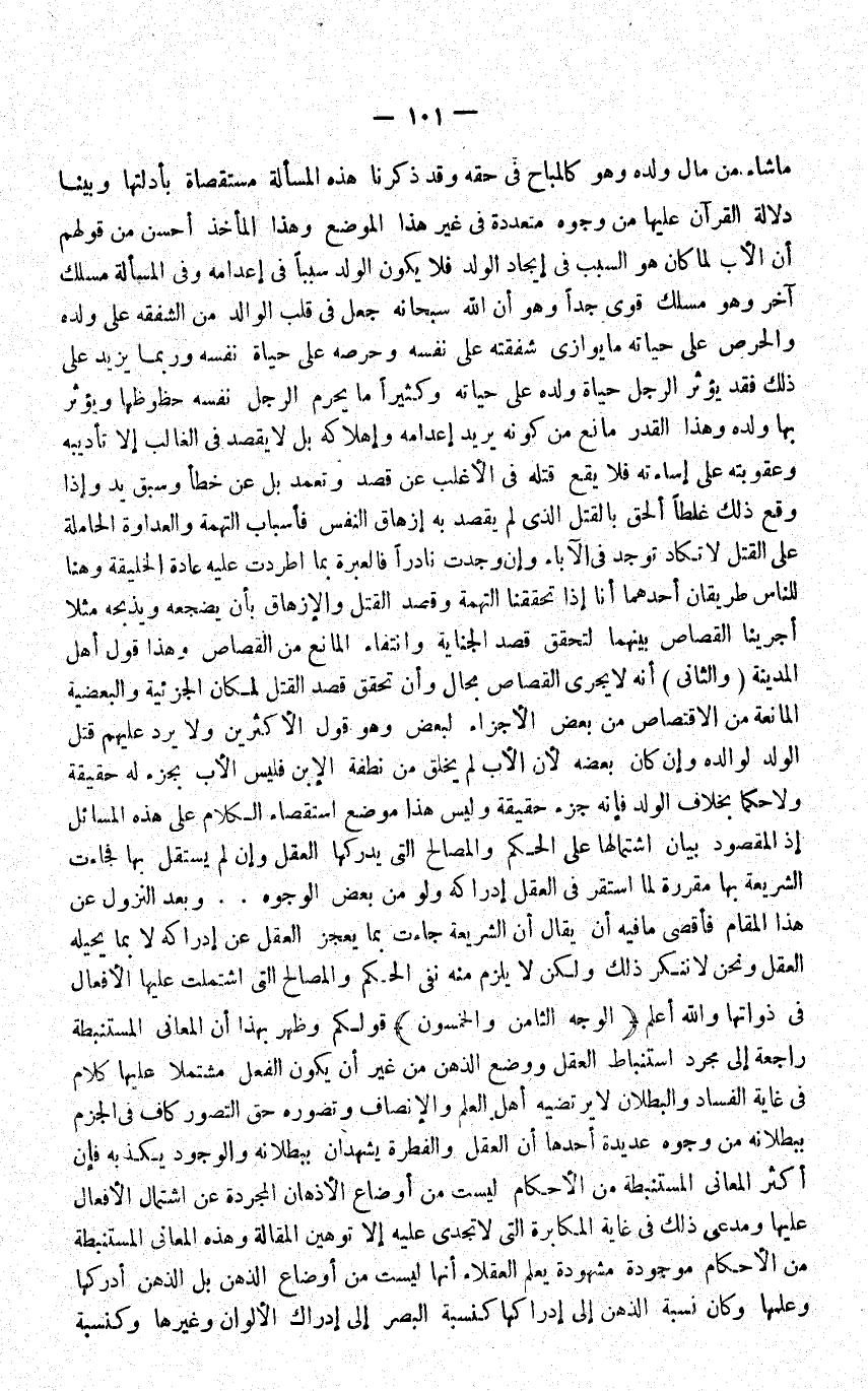 أَحدهمَا أَنا إِذا تحققنا التُّهْمَة وَقصد الْقَتْل والإزهاق بِأَن يضجعه ويذبحه مثلا أجرينا الْقصاص بَينهمَا لتحَقّق قصد الْجِنَايَة وَانْتِفَاء الْمَانِع من الْقصاص وَهَذَا قَول أهل الْمَدِينَة وَالثَّانِي أَنه لَا يجرى الْقصاص بِحَال وَأَن تحقق قصد الْقَتْل لمَكَان الْجُزْئِيَّة والبعضية الْمَانِعَة من الاقتصاص من بعض الْأَجْزَاء لبَعض وَهُوَ قَول الْأَكْثَرين وَلَا يرد عَلَيْهِم قتل الْوَلَد لوالده وان كَانَ بعضه لِأَن الْأَب لم يخلق من نُطْفَة الابْن فَلَيْسَ الْأَب بِجُزْء لَهُ حَقِيقَة وَلَا حكما بِخِلَاف الْوَلَد فانه جُزْء حَقِيقَة وَلَيْسَ هَذَا مَوْضُوع استقصاء الْكَلَام على هَذِه الْمسَائِل إِذْ الْمَقْصُود بَيَان اشتمالها على الحكم والمصالح الَّتِي يُدْرِكهَا الْعقل وان لم يسْتَقلّ بهَا فَجَاءَت الشَّرِيعَة بهَا مقررة لما اسْتَقر فِي الْعقل إِدْرَاكه وَلَو من بعض الْوُجُوه وَبعد النُّزُول عَن هَذَا الْمقَام فأقصى مَا فِيهِ أَن يُقَال أَن الشَّرِيعَة جَاءَت بِمَا يعجز الْعقل عَن إِدْرَاكه لَا بِمَا يحيله الْعقل وَنحن لَا ننكر ذَلِك وَلَكِن لَا يلْزم مِنْهُ نفى الحكم والمصالح الَّتِي اشْتَمَلت عَلَيْهَا الْأَفْعَال فِي ذواته وَالله أعلم