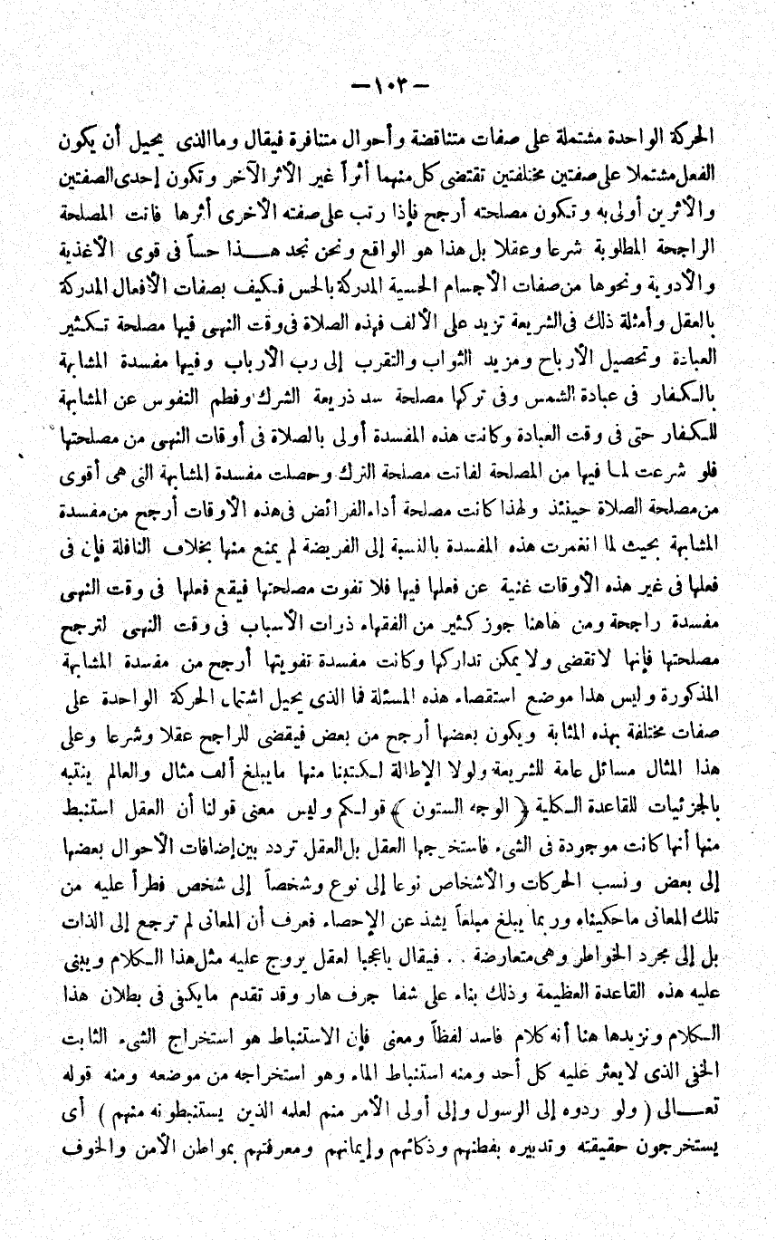 الْحَرَكَة الْوَاحِدَة مُشْتَمِلَة على صِفَات متناقضة وأحوال متنافرة فَيُقَال وَمَا الَّذِي يحِيل أَن يكون الْفِعْل مُشْتَمِلًا على صفتين مختلفتين تَقْتَضِي كل مِنْهُمَا أثرا غير الْأَثر الآخر وَتَكون إِحْدَى الصفتين والأثرين أولى بِهِ وَتَكون مصْلحَته أرجح فَإِذا رتب على صفته الْأُخْرَى أَثَرهَا فَاتَت الْمصلحَة الراجحة الْمَطْلُوبَة شرعا وعقلا بل هَذَا هُوَ الْوَاقِع وَنحن نجد هَذَا حسا فِي قوى الأغذية والأدوية وَنَحْوهَا من صِفَات الْأَجْسَام الحسية المدركة بالحس فَكيف بِصِفَات الْأَفْعَال المدركة بِالْعقلِ وأمثلة ذَلِك فِي الشَّرِيعَة تزيد على الْألف فَهَذِهِ الصَّلَاة فِي وَقت النَّهْي فِيهَا مصلحَة تَكْثِير الْعِبَادَة وَتَحْصِيل الأرباح ومزيد الثَّوَاب والتقرب إِلَى رب الأرباب وفيهَا مفْسدَة المشابهة بالكفار فِي عبَادَة الشَّمْس وَفِي تَركهَا مصلحَة سد ذَرِيعَة الشّرك وفطم النُّفُوس عَن المشابهة للْكفَّار حَتَّى فِي وَقت الْعِبَادَة وَكَانَت هَذِه الْمفْسدَة أولى بِالصَّلَاةِ فِي أَوْقَات النَّهْي من مصلحتها فَلَو شرعت لما فِيهَا من الْمصلحَة لفاتت مصلحَة التّرْك وحصلت مفْسدَة المشابهة الَّتِي هِيَ أقوى من مصلحَة الصَّلَاة حِينَئِذٍ وَلِهَذَا كَانَت مصلحَة أَدَاء الْفَرَائِض فِي هَذِه الْأَوْقَات أرجح من مفْسدَة المشابهة بِحَيْثُ لما انغمرت هَذِه الْمفْسدَة بِالنِّسْبَةِ إِلَى الْفَرِيضَة لم يمْنَع مِنْهَا بِخِلَاف النَّافِلَة فان فِي فعلهَا فِي غير هَذِه الْأَوْقَات غنية عَن فعلهَا فِيهَا فَلَا تفوت مصلحتها فَيَقَع فعلهَا فِي وَقت النَّهْي مفْسدَة راجحة وَمن هَاهُنَا جوز كثير من الْفُقَهَاء ذَوَات الْأَسْبَاب فِي وَقت النَّهْي لترجح مصلحتها فَأَنَّهَا لَا تقضى وَلَا يُمكن تداركها وَكَانَت مفْسدَة تفويتها أرجح من مفْسدَة المشابهة الْمَذْكُورَة وَلَيْسَ هَذَا مَوضِع استقصاء هَذِه الْمَسْأَلَة فَمَا الَّذِي يحِيل اشْتِمَال الْحَرَكَة الْوَاحِدَة على صِفَات مُخْتَلفَة بِهَذِهِ المثابة وَيكون بَعْضهَا أرجح من بعض فَيقْضى للراجح عقلا وَشرعا وعَلى هَذَا الْمِثَال مسَائِل عَامَّة للشريعة وَلَوْلَا إلاطالة لكتبنا مِنْهَا مَا يبلغ ألف مِثَال والعالم ينتبه بالجزئيات للقاعدة الْكُلية