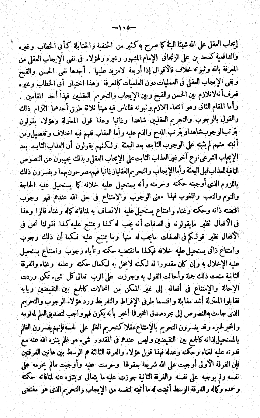 أيجاب الْعقل على الله شَيْئا الْبَتَّةَ كَمَا صرح بِهِ كثير من الْحَنَفِيَّة والحنابلة كَأبي الْخطاب وَغَيره وَالشَّافِعِيَّة كسعد بن عَليّ الزنجاني الْأَمَام الْمَشْهُور وَغَيره ولهؤلاء فِي نفي الْإِيجَاب الْعقلِيّ من الْمعرفَة بِاللَّه وثبوته خلاف فالأقوال إِذا أَرْبَعَة لَا مزِيد عَلَيْهَا