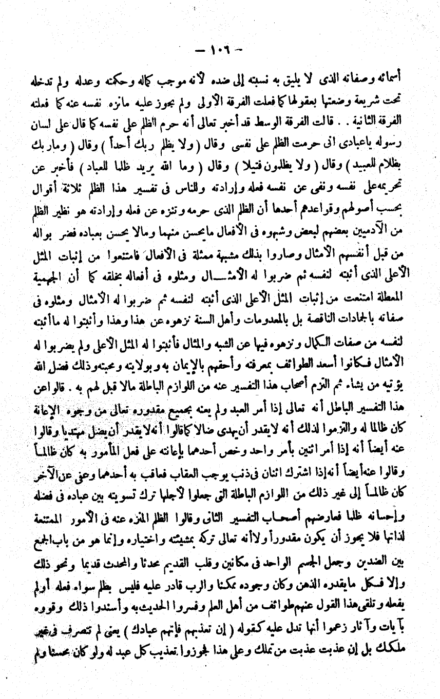 قَالُوا عَن هَذَا التَّفْسِير الْبَاطِل أَنه تَعَالَى إِذا أَمر العَبْد وَلم يعنه بِجَمِيعِ مقدوره تَعَالَى من وُجُوه الْإِعَانَة كَانَ ظَالِما لَهُ والتزموا لذَلِك أَنه لَا يقدر أَن يهدي ضَالًّا كَمَا قَالُوا أَنه لَا يقدر أَن يضل مهتديا وَقَالُوا عَنهُ أَيْضا أَنه إِذا أَمر اثْنَيْنِ بِأَمْر وَاحِد وَخص أَحدهمَا بإعانته على فعل الْمَأْمُور بِهِ كَانَ ظَالِما وَقَالُوا عَنهُ أَيْضا أَنه إِذا اشْترك اثْنَان فِي ذَنْب يُوجب الْعقَاب فعاقب بِهِ أَحدهمَا وَعفى عَن الآخر كَانَ ظَالِما إِلَى غير ذَلِك من اللوازم الْبَاطِلَة الَّتِي جعلُوا لأَجلهَا ترك تسويته بَين عباده فِي فَضله وإحسانه ظلما فعارضهم أَصْحَاب التَّفْسِير الثَّانِي وَقَالُوا الظُّلم المنزه عَنهُ فِي الْأُمُور الممتنعة لذاتها فَلَا يجوز أَن يكون مَقْدُورًا وَلَا أَنه تَعَالَى تَركه بمشيئته واختياره وانما هُوَ من بَاب الْجمع بَين الضدين وَجعل الْجِسْم الْوَاحِد فِي مكانين وقلب الْقَدِيم مُحدثا والمحدث قَدِيما وَنَحْو ذَلِك وَألا فَكل مَا يقدره الذِّهْن وَكَانَ وجوده مُمكنا والرب قَادر عَلَيْهِ فَلَيْسَ بظُلْم سَوَاء فعله أَو لم يَفْعَله وتلقى هَذَا القَوْل عَنْهُم طوائف من أهل الْعلم وفسروا الحَدِيث بِهِ وأسندوا ذَلِك وقووه بآيَات وآثار زَعَمُوا أَنَّهَا تدل عَلَيْهِ كَقَوْلِه {إِن تُعَذبهُمْ فَإِنَّهُم عِبَادك} يَعْنِي لم تتصرف فِي غير ملكك بل أَن عذبت عذبت من تملك وعَلى هَذَا فجوزوا تَعْذِيب كل عبد لَهُ وَلَو كَانَ محسنا وَلم
