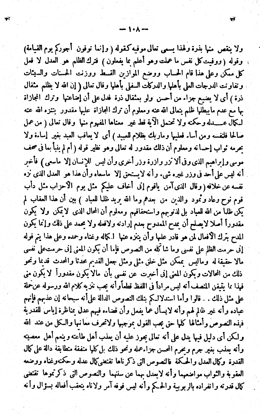 وَلَا ينقص مِنْهَا بذرة وَلِهَذَا يُسمى تَعَالَى موفيه كَقَوْلِه {وَإِنَّمَا توفون أجوركم يَوْم الْقِيَامَة} وَقَوله {ووفيت كل نفس مَا عملت وَهُوَ أعلم بِمَا يَفْعَلُونَ} فَترك الظُّلم هُوَ الْعدْل لافعل كل مُمكن وعَلى هَذَا قَامَ الْحساب وَوضع الموازين الْقسْط ووزنت الْحَسَنَات والسيئات وتفاوتت الدَّرَجَات العلى بِأَهْلِهَا والدركات السُّفْلى بِأَهْلِهَا وَقَالَ تَعَالَى {إِن الله لَا يظلم مِثْقَال ذرة} أَي لَا يضيع جَزَاء من أحسن وَلَو بمثقال ذرة فَدلَّ على أَن اضاعتها وَترك المجازاة بهَا مَعَ عدم مَا يُبْطِلهَا ظلم يتعالى الله عَنهُ وَمَعْلُوم أَن ترك المجازاة عَلَيْهَا مَقْدُور يتنزه الله عَنهُ لكَمَال عدله وحكمته وَلَا تحْتَمل الْآيَة قطّ غير مَعْنَاهَا الْمَفْهُوم مِنْهَا وَقَالَ تَعَالَى {من عمل صَالحا فلنفسه وَمن أَسَاءَ فعلَيْهَا وَمَا رَبك بظلام للعبيد} أَي لَا يُعَاقب العَبْد بِغَيْر إساءة وَلَا يحرمه ثَوَاب إحسانه وَمَعْلُوم أَن ذَلِك مَقْدُور لَهُ تَعَالَى وَهُوَ نَظِير قَوْله {أم لم ينبأ بِمَا فِي صحف مُوسَى وَإِبْرَاهِيم الَّذِي وفى أَلا تزر وَازِرَة وزر أُخْرَى وَأَن لَيْسَ للْإنْسَان إِلَّا مَا سعى} فَأخْبر انه لَيْسَ على أحد فِي وزر غَيره شَيْء