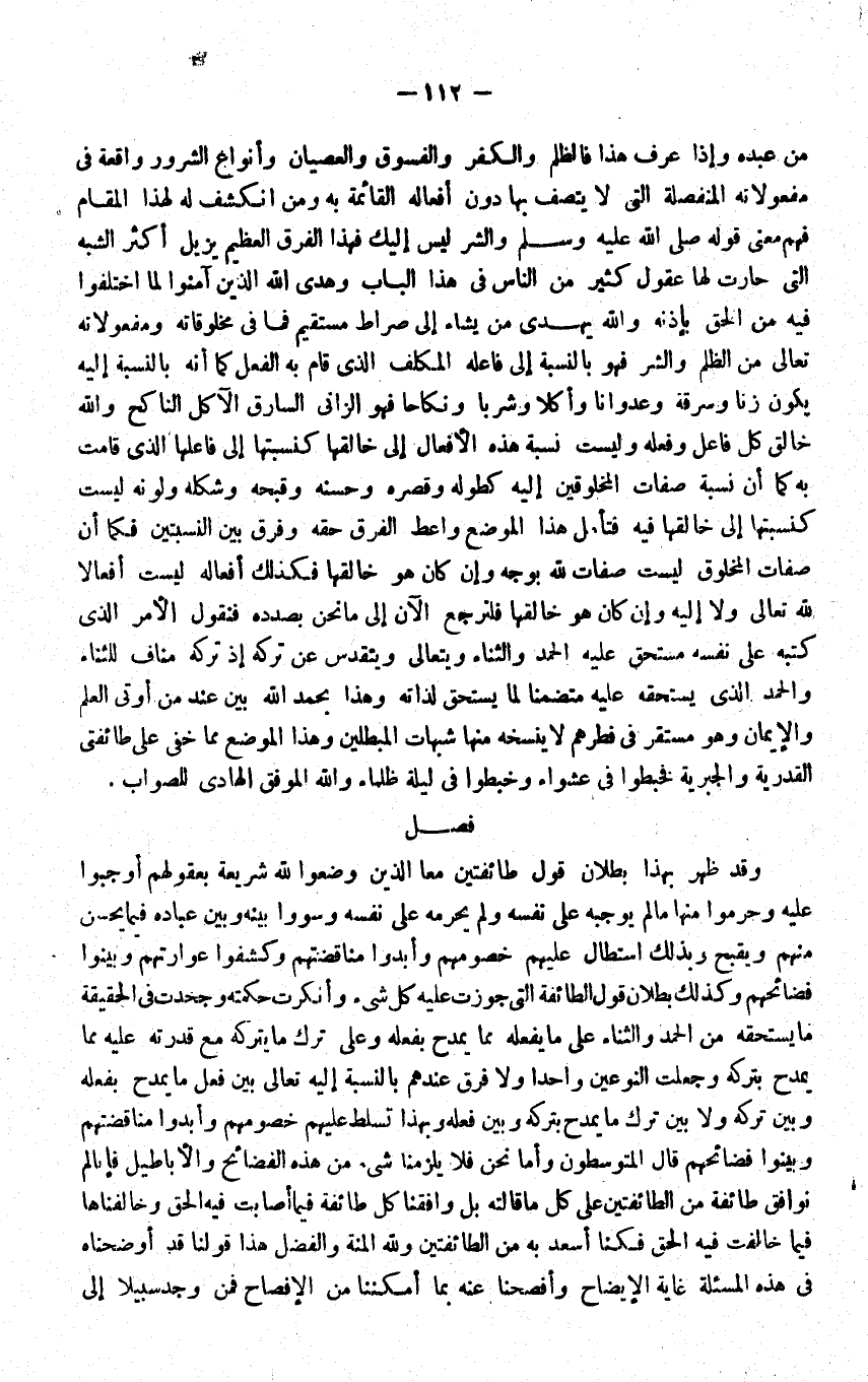 من عَبده وَإِذا عرف هَذَا فالظلم وَالْكفْر والفسوق والعصيان وأنواع الشرور وَاقعَة فِي مفعولاته الْمُنْفَصِلَة الَّتِي لَا يَتَّصِف بهَا دون أَفعاله الْقَائِمَة بِهِ وَمن انْكَشَفَ لَهُ لهَذَا الْمقَام فهم معنى قَوْله وَالشَّر لَيْسَ إِلَيْك فَهَذَا الْفرق الْعَظِيم يزِيل أَكثر الشّبَه الَّتِي حارت لَهَا عقول كثير من النَّاس فِي هَذَا الْبَاب وَهدى الله الَّذين آمنُوا لما اخْتلفُوا فِيهِ من الْحق بأذنه وَالله يهدي من يَشَاء إِلَيّ صِرَاط مُسْتَقِيم فَمَا فِي مخلوقاته ومفعولاته تَعَالَى من الظُّلم وَالشَّر فَهُوَ بِالنِّسْبَةِ إِلَيّ فَاعله الْمُكَلف الَّذِي قَامَ بِهِ الْفِعْل كَمَا أَنه بِالنِّسْبَةِ إِلَيْهِ يكون زنا وسرقة وعدوانا وأكلا وشربا ونكاحا فَهُوَ الزَّانِي السَّارِق الْآكِل الناكح وَالله خَالق كل فَاعل وَفعله وَلَيْسَت نِسْبَة هَذِه الْأَفْعَال إِلَيّ خَالِقهَا كنسبتها إِلَيّ فاعلها الَّذِي قَامَت بِهِ كَمَا أَن نِسْبَة صِفَات المخلوقين إِلَيْهِ كَطُولِهِ وقصره وَحسنه وقبحه وشكله ولونه لَيست كنسبتها إِلَيّ خَالِقهَا فِيهِ فَتَأمل هَذَا الْموضع واعط الْفرق حَقه وَفرق بَين النسبتين فَكَمَا أَن صِفَات الْمَخْلُوق لَيست صِفَات لله بِوَجْه وان كَانَ هُوَ خَالِقهَا فَكَذَلِك أَفعاله لَيست أفعالا لله تَعَالَى وَلَا إِلَيْهِ وان كَانَ هُوَ خَالِقهَا فلنرجع الْآن إِلَيّ مَا نَحن بصدده فَنَقُول الْأَمر الَّذِي كتبه على نَفسه مُسْتَحقّ عَلَيْهِ الْحَمد وَالثنَاء ويتعالى ويتقدس عَن تَركه إِذْ تَركه منَاف للثناء وَالْحَمْد الَّذِي يسْتَحقّهُ عَلَيْهِ متضمنا لما يسْتَحق لذاته وَهَذَا بِحَمْد الله بَين عِنْد من أُوتى الْعلم والأيمان وَهُوَ مُسْتَقر فِي فطرهم لَا ينسخه مِنْهَا شُبُهَات المبطلين وَهَذَا الْموضع مِمَّا خفى على طائفتي الْقَدَرِيَّة والجبرية فخبطوا فِي عشواء وخبطوا فِي لَيْلَة ظلماء وَالله الْمُوفق الْهَادِي للصَّوَاب