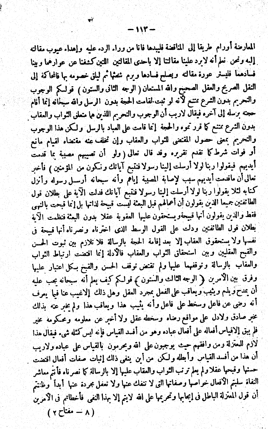 الْوَجْه الثَّانِي وَالسِّتُّونَ قَوْلكُم الْوُجُوب وَالتَّحْرِيم بِدُونِ الشَّرْع مُمْتَنع لِأَنَّهُ لَو ثَبت لقامت الْحجَّة بِدُونِ الرُّسُل وَالله سُبْحَانَهُ إِنَّمَا أَقَامَ حجَّته برسله إِلَى آخِره فَيُقَال لَا ريب أَن الْوُجُوب وَالتَّحْرِيم اللَّذين هما مُتَعَلق الثَّوَاب وَالْعِقَاب بِدُونِ الشَّرْع مُمْتَنع كَمَا قررتموه وَالْحجّة إِنَّمَا قَامَت على الْعباد بالرسل وَلَكِن هَذَا الْوُجُوب وَالتَّحْرِيم بِمَعْنى حُصُول الْمُقْتَضى للثَّواب وَالْعِقَاب وان تخلف عَنهُ مُقْتَضَاهُ لقِيَام مَانع أَو فَوَات شَرط كَمَا تقدم تَقْرِيره وَقد قَالَ تَعَالَى وَلَوْلَا أَن تصيبهم مُصِيبَة بِمَا قدمت أَيْديهم فيقولوا رَبنَا لَوْلَا أرْسلت الينا رَسُولا فنتبع آياتك ونكون من الْمُؤمنِينَ فَأخْبر تَعَالَى أَن مَا قدمت أَيْديهم سَبَب لاصابة الْمُصِيبَة إيَّاهُم وَأَنه سُبْحَانَهُ أرسل رَسُوله وَأنزل كِتَابه لِئَلَّا يَقُولُوا رَبنَا لَوْلَا أرْسلت الينا رَسُولا فنتبع آياتك فدلت الْآيَة على بطلَان قَول الطَّائِفَتَيْنِ جَمِيعًا الَّذين يَقُولُونَ أَن أَعْمَالهم قبل الْبعْثَة لَيست قبيحة لذاتها بل إِنَّمَا قبحت بِالنَّهْي فَقَط وَالَّذين يَقُولُونَ أَنَّهَا قبيحة ويستحقون عَلَيْهَا الْعقُوبَة عقلا بِدُونِ الْبعْثَة فنظمت الْآيَة بطلَان قَول الطَّائِفَتَيْنِ ودلت على القَوْل الْوسط الَّذِي اخترناه ونصرناه أَنَّهَا قبيحة فِي نَفسهَا وَلَا يسْتَحقُّونَ الْعقَاب إِلَّا بعد إِقَامَة الْحجَّة بالرسالة فَلَا تلازم بَين ثُبُوت الْحسن والقبح العقليين وَبَين اسْتِحْقَاق الثَّوَاب وَالْعِقَاب فالأدلة إِنَّمَا اقْتَضَت ارتباط الثَّوَاب وَالْعِقَاب بالرسالة وتوقفهما عَلَيْهَا وَلم تقتض توقف الْحسن والقبح بِكُل اعْتِبَار عَلَيْهَا وَفرق بَين الْأَمريْنِ