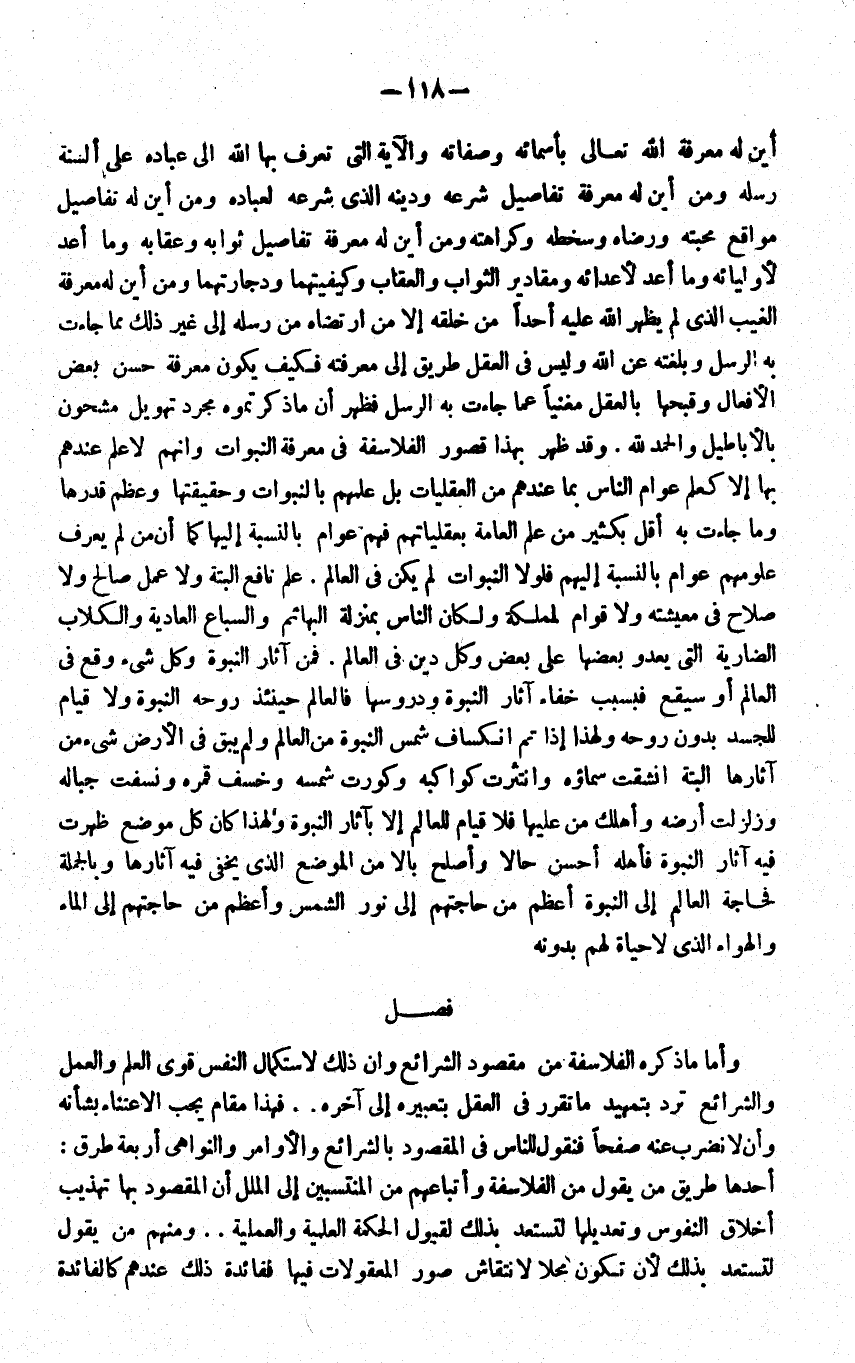 وَقد ظهر بِهَذَا الْقُصُور الفلاسفة فِي معرفَة النبوات وَأَنَّهُمْ لَا علم عِنْدهم بهَا إِلَّا كعلم عوام النَّاس بِمَا عِنْدهم من ألعقليات بل علمهمْ بالنبوات وحقيقتها وَعظم قدرهَا وَمَا جَاءَت بِهِ اقل بِكَثِير من علم الْعَامَّة بعقلياتهم فهم عوام بِالنِّسْبَةِ إِلَيْهَا كَمَا أَن من لم يعرف علومهم عوام بِالنِّسْبَةِ إِلَيْهِم فلولا النبوات لم يكن فِي الْعَالم علم نَافِع الْبَتَّةَ وَلَا عمل صَالح وَلَا صَلَاح فِي معيشته وَلَا قوام لمملكة ولكان النَّاس بِمَنْزِلَة الْبَهَائِم وَالسِّبَاع العادية وَالْكلاب الضارية الَّتِي يعدو بَعْضهَا على بعض وكل دين فِي الْعَالم