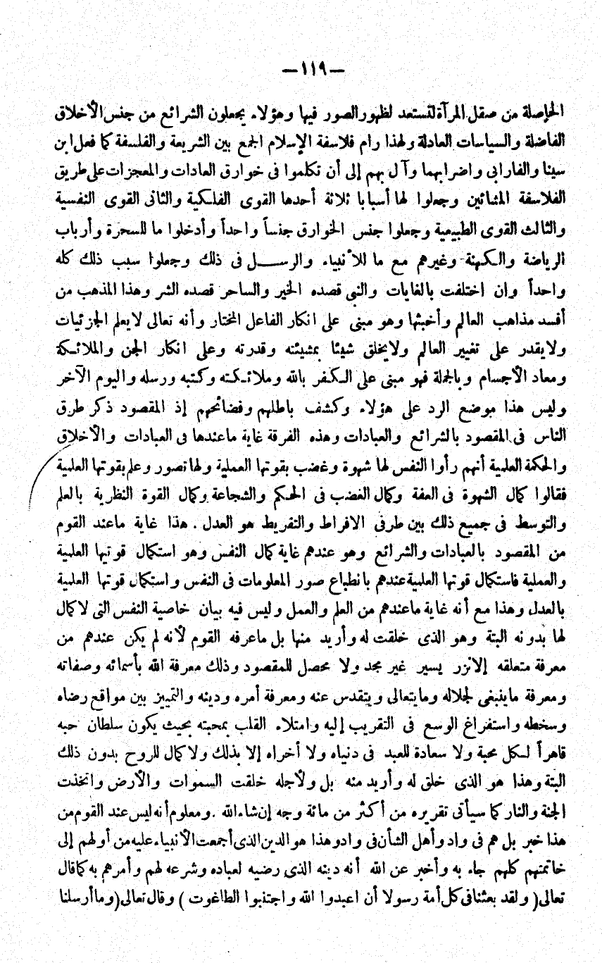الْحَاصِلَة من صقل الْمرْآة لتستعد لظُهُور الصُّور فِيهَا وَهَؤُلَاء يجْعَلُونَ الشَّرَائِع من جنس الْأَخْلَاق الفاضلة والسياسات العادلة وَلِهَذَا رام فلاسفة الْإِسْلَام الْجمع بَين الشَّرِيعَة والفلسفة كَمَا فعل ابْن سينا والفارابي واضرابهما وَآل بهم أَن تكلمُوا فِي خوارق الْعَادَات والمعجزات على طَرِيق الفلاسفة الْمَشَّائِينَ وَجعلُوا لَهَا أسبابا ثَلَاثَة أَحدهَا القوى الفلكية وَالثَّانِي القوى النفسية وَالثَّالِث القوى الطبيعية وَجعلُوا جنس الخوارق