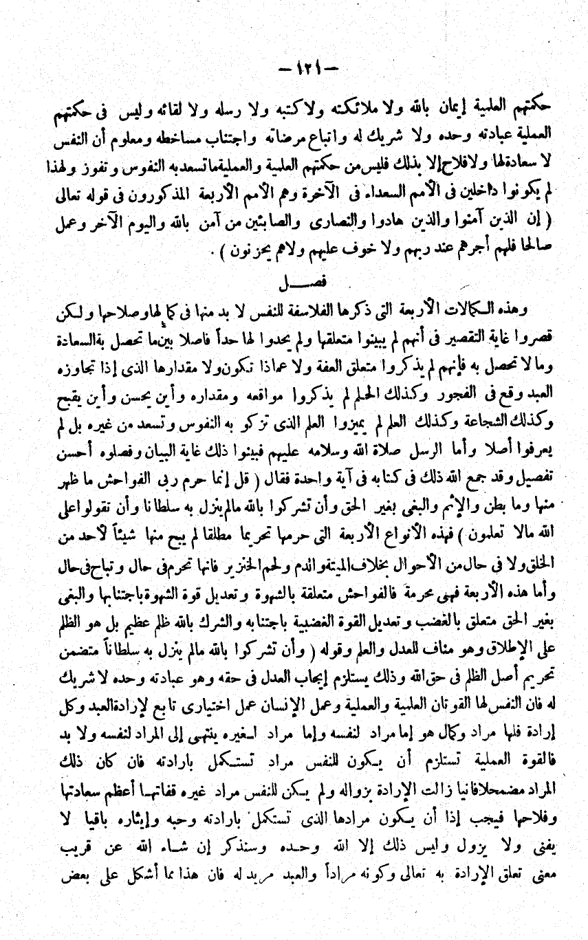 فِي كَمَا لَهَا وصلاحها وَلَكِن قصروا غَايَة التَّقْصِير فِي أَنهم لم يبينوا متعلقها وَلم يحدوا لَهَا حدا فاصلا بَين مَا تحصل بِهِ السَّعَادَة وَمَا لَا تحصل بِهِ فانهم لم يذكرُوا مُتَعَلق الْعِفَّة وَلَا عماذا تكون وَلَا مقدارها الَّذِي إِذا تجاوزه العَبْد وَقع فِي الْفُجُور وَكَذَلِكَ الْحلم لم يذكرُوا مواقعه ومقداره وَأَيْنَ يحسن وَأَيْنَ يقبح وَكَذَلِكَ الشجَاعَة وَكَذَلِكَ الْعلم لم يميزوا الْعلم الَّذِي تزكو بِهِ النُّفُوس وتسعد من غَيره بل لم يعرفوا أصلا وَأما الرُّسُل صَلَاة الله وَسَلَامه عَلَيْهِم فبينوا ذَلِك غَايَة الْبَيَان وفصلوه أحسن تَفْصِيل وَقد جمع الله ذَلِك فِي كِتَابه فِي آيَة وَاحِدَة فَقَالَ {قل إِنَّمَا حرم رَبِّي الْفَوَاحِش مَا ظهر مِنْهَا وَمَا بطن وَالْإِثْم وَالْبَغي بِغَيْر الْحق وَأَن تُشْرِكُوا بِاللَّه مَا لم ينزل بِهِ سُلْطَانا وَأَن تَقولُوا على الله مَا لَا تعلمُونَ} فَهَذِهِ الْأَنْوَاع الْأَرْبَعَة الَّتِي حرمهَا تَحْرِيمًا مُطلقًا لم يبح مِنْهَا شَيْئا لأحد من الْخلق وَلَا فِي حَال من الْأَحْوَال بِخِلَاف الْميتَة وَالدَّم وَلحم الْخِنْزِير فَأَنَّهَا تحرم فِي حَال وتباح فِي حَال وَأما هَذِه الْأَرْبَعَة فَهِيَ مُحرمَة فالفواحش مُتَعَلقَة بالشهوة وتعديل قُوَّة الشَّهْوَة باجتنابها وَالْبَغي بِغَيْر الْحق مُتَعَلق بِالْغَضَبِ وتعديل الْقُوَّة الغضبية باجتنابه والشرك بِاللَّه ظلم عَظِيم بل هُوَ الظُّلم على الْإِطْلَاق وَهُوَ منَاف للعدل وَالْعلم وَقَوله وَأَن تُشْرِكُوا بِاللَّه مَا لم ينزل بِهِ سُلْطَانا مُتَضَمّن تَحْرِيم أصل الظُّلم فِي حق الله وَذَلِكَ يسْتَلْزم إِيجَاب الْعدْل فِي حَقه وَهُوَ عِبَادَته وَحده لَا شريك لَهُ فان النَّفس لَهَا القوتان العلمية والعملية وَعمل الْإِنْسَان عمل اخْتِيَاري تَابع لارادة العَبْد وكل إِرَادَة فلهَا مُرَاد وَكَمَال هُوَ أما مُرَاد لنَفسِهِ واما مُرَاد لغيره يَنْتَهِي إِلَيّ المُرَاد لنَفسِهِ وَلَا بُد فالقوة العملية تَسْتَلْزِم أَن يكون للنَّفس مُرَاد تستكمل بإرادته فان كَانَ ذَلِك المُرَاد مضمحلا فانيا زَالَت الْإِرَادَة بزواله وَلم يكن للنَّفس مُرَاد غَيره قفاتها أعظم سعادتها وفلاحها فَيجب إِذا أَن يكون مرادها الَّذِي تستكمل بإرادته وحبه وإيثاره بَاقِيا لَا يفنى وَلَا يَزُول وَلَيْسَ ذَلِك إِلَّا الله وَحده وَسَنذكر أَن شَاءَ الله عَن قريب معنى تعلق الْإِرَادَة بِهِ تَعَالَى وَكَونه مرَادا وَالْعَبْد مُرِيد لَهُ فان هَذَا مِمَّا أشكل على بعض