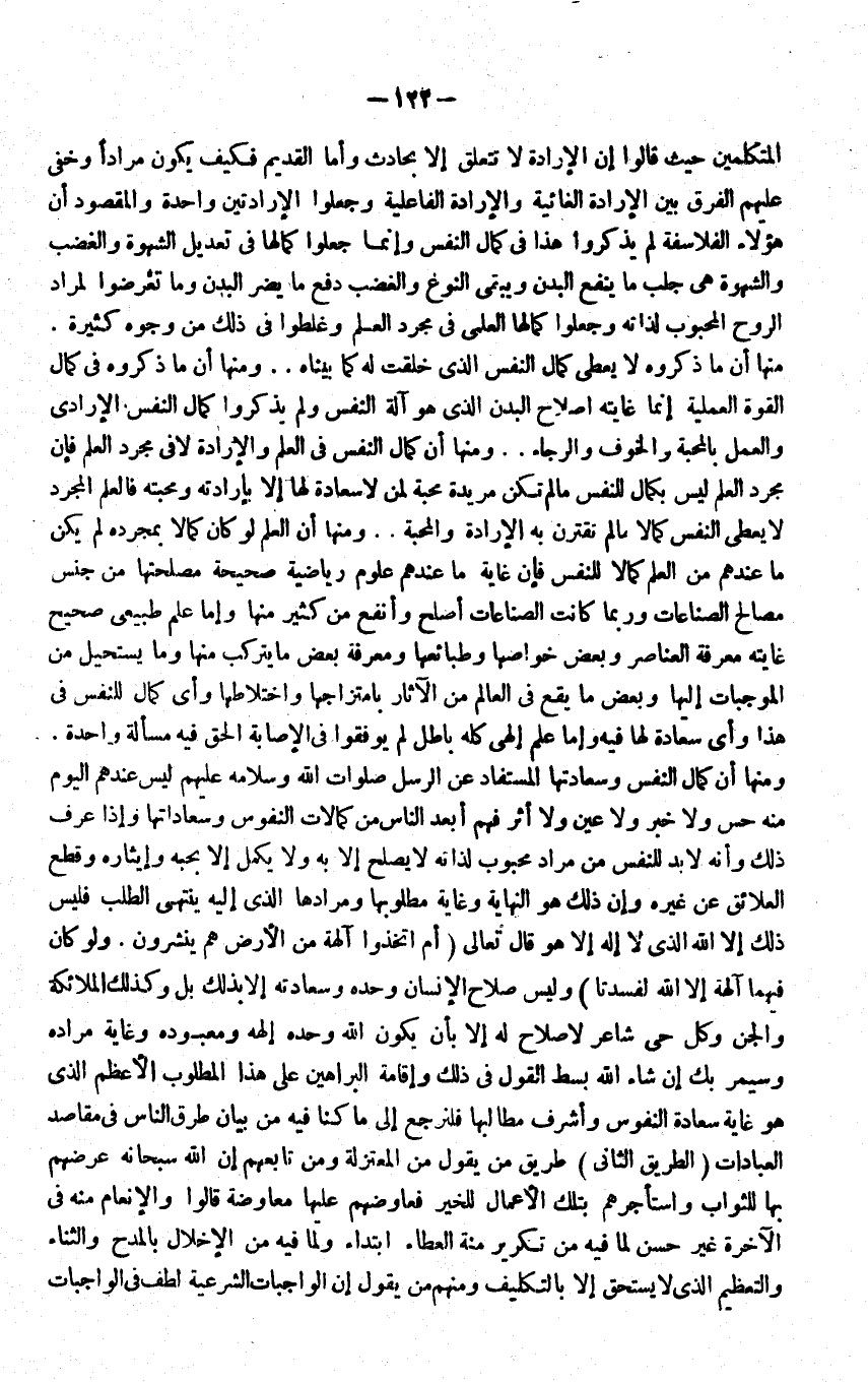 الْمُتَكَلِّمين حَيْثُ قَالُوا أَن الْإِرَادَة لَا تتَعَلَّق إِلَّا بحادث وَأما الْقَدِيم فَكيف يكون مرَادا وخفى عَلَيْهِم الْفرق بَين الْإِرَادَة الغائبة والإرادة الفاعلية وَجعلُوا الارادتين وَاحِدَة وَالْمَقْصُود أَن هَؤُلَاءِ الفلاسفة لم يذكرُوا هَذَا فِي كَمَال النَّفس وانما جعلُوا كمالها فِي تَعْدِيل الشَّهْوَة وَالْغَضَب والشهوة هِيَ جلب مَا ينفع الْبدن وَيبقى النوغ وَالْغَضَب دفع مَا يضر الْبدن وَمَا تعرضوا لمراد الرّوح المحبوب لذاته وَجعلُوا كمالها العلمي فِي مُجَرّد الْعلم وغلطوا فِي ذَلِك من وُجُوه كَثِيرَة مِنْهَا أَن مَا ذَكرُوهُ لَا يُعْطي كَمَال النَّفس الَّذِي خلقت لَهُ كَمَا بَيناهُ وَمِنْهَا أَن مَا ذَكرُوهُ فِي كَمَال الْقُوَّة العملية إِنَّمَا غَايَته إصْلَاح الْبدن الَّذِي هُوَ آلَة النَّفس وَلم يذكرُوا كَمَال النَّفس الإرادي وَالْعَمَل بالمحبة وَالْخَوْف والرجاء وَمِنْهَا أَن كَمَال النَّفس فِي الْعلم والإرادة لَا فِي مُجَرّد الْعلم فان مُجَرّد الْعلم لَيْسَ بِكَمَال للنَّفس مَا لم تكن مريدة محبَّة لمن لَا سَعَادَة لَهَا إِلَّا بإرادته ومحبته فالعلم الْمُجَرّد لَا يُعْطي النَّفس كَمَا لَا مَا لم تقترن بِهِ الْإِرَادَة والمحبة وَمِنْهَا أَن الْعلم لَو كَانَ كمالا بِمُجَرَّدِهِ لم يكن مَا عِنْدهم من الْعلم كَمَا لَا للنَّفس فان غَايَة مَا عِنْدهم عُلُوم رياضية صَحِيحَة مصلحتها من جنس مصَالح الصناعات وَرُبمَا كَانَت الصناعات أصلح وأنفع من كثير مِنْهَا واما علم طبيعي صَحِيح غَايَته معرفَة العناصر وَبَعض خواصها وطبائعها وَمَعْرِفَة بعض مَا يتركب مِنْهَا وَمَا يَسْتَحِيل من الموجبات إِلَيْهَا وَبَعض مَا يَقع فِي الْعَالم من الْآثَار بامتزاجها واختلاطها وَأي كَمَال للنَّفس فِي هَذَا وَأي سَعَادَة لَهَا فِيهِ واما علم الهي كُله بَاطِل لم يوفقوا فِي الْإِصَابَة الْحق فِيهِ مَسْأَلَة وَاحِدَة