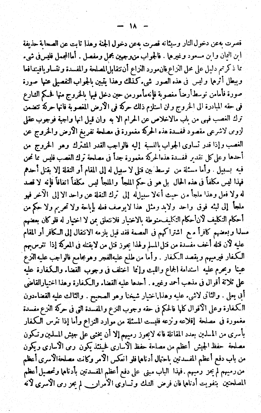 وَأما الْمُجْمل فَلَيْسَ فِي شَيْء مِمَّا ذكرْتُمْ دَلِيل على مَحل النزاع فان مورد النزاع أَن تتقابل الْمصلحَة والمفسدة وتتساويا فيتدافعا وَيبْطل أثرهما وَلَيْسَ فِي هَذِه الصُّور شَيْء كَذَلِك وَهَذَا يتَبَيَّن بِالْجَوَابِ التفصيلي عَنْهَا صُورَة فَأَما من توَسط أَرضًا مَغْصُوبَة فَإِنَّهُ مَأْمُور من حِين دخل فِيهَا بِالْخرُوجِ مِنْهَا فَحكم الشَّارِع فِي حَقه الْمُبَادرَة إِلَى الْخُرُوج وان استلزم ذَلِك حَرَكَة فِي الأَرْض الْمَغْصُوبَة فَإِنَّهَا حَرَكَة تَتَضَمَّن ترك الْغَصْب فَهِيَ من بَاب مَالا خلاص عَن الْحَرَام إِلَّا بِهِ وان قيل إِنَّهَا وَاجِبَة فوجوب عَقْلِي لزومي لَا شَرْعِي مَقْصُود فمفسدة هَذِه الْحَرَكَة مغمورة فِي مصلحَة تَفْرِيغ الأَرْض وَالْخُرُوج عَن الْغَصْب وَإِذا قدر تَسَاوِي الْجَواب بِالنِّسْبَةِ إِلَيْهِ فَالْوَاجِب الْقدر الْمُشْتَرك وَهُوَ الْخُرُوج من أَحدهَا وعَلى كل تَقْدِير فمفسدة هَذِه الْحَرَكَة مغمورة جدا فِي مصلحَة ترك الْغَصْب فَلَيْسَ مِمَّا نَحن فِيهِ بسبيل وَأما مسئلة من توَسط بَين قَتْلَى لَا سَبِيل لَهُ إِلَى الْمقَام أَو النقلَة إِلَّا بقتل أحدهم فَهَذَا لَيْسَ مُكَلّفا فِي هَذِه الْحَال بل هُوَ فِي حكم الملجأ والملجأ لَيْسَ مُكَلّفا اتِّفَاقًا فَإِنَّهُ لَا قصد لَهُ وَلَا فعل وَهَذَا ملْجأ من حَيْثُ أَنه لَا سَبِيل لَهُ إِلَى ترك النقلَة عَن وَاحِد إِلَّا إِلَى الآخر فَهُوَ ملْجأ إِلَى لبثه فَوق وَاحِد وَلَا بُد وَمثل هَذَا لَا يُوصف فعله بِإِبَاحَة وَلَا تَحْرِيم وَلَا حكم من أَحْكَام التَّكْلِيف لِأَن أَحْكَام التَّكْلِيف منوطة بِالِاخْتِيَارِ فَلَا تتَعَلَّق بِمن لَا اخْتِيَار لَهُ فَلَو كَانَ بَعضهم مُسلما وَبَعْضهمْ كَافِرًا مَعَ اشتراكهم فِي الْعِصْمَة فقد قيل يلْزمه الِانْتِقَال إِلَى الْكَافِر أَو الْمقَام عَلَيْهِ لِأَن قَتله أخف مفْسدَة من قتل الْمُسلم وَلِهَذَا يجوز قتل من لَا يقْتله فِي المعركة إِذا تترس بهم الْكفَّار فيرميهم ويقصد الْكفَّار