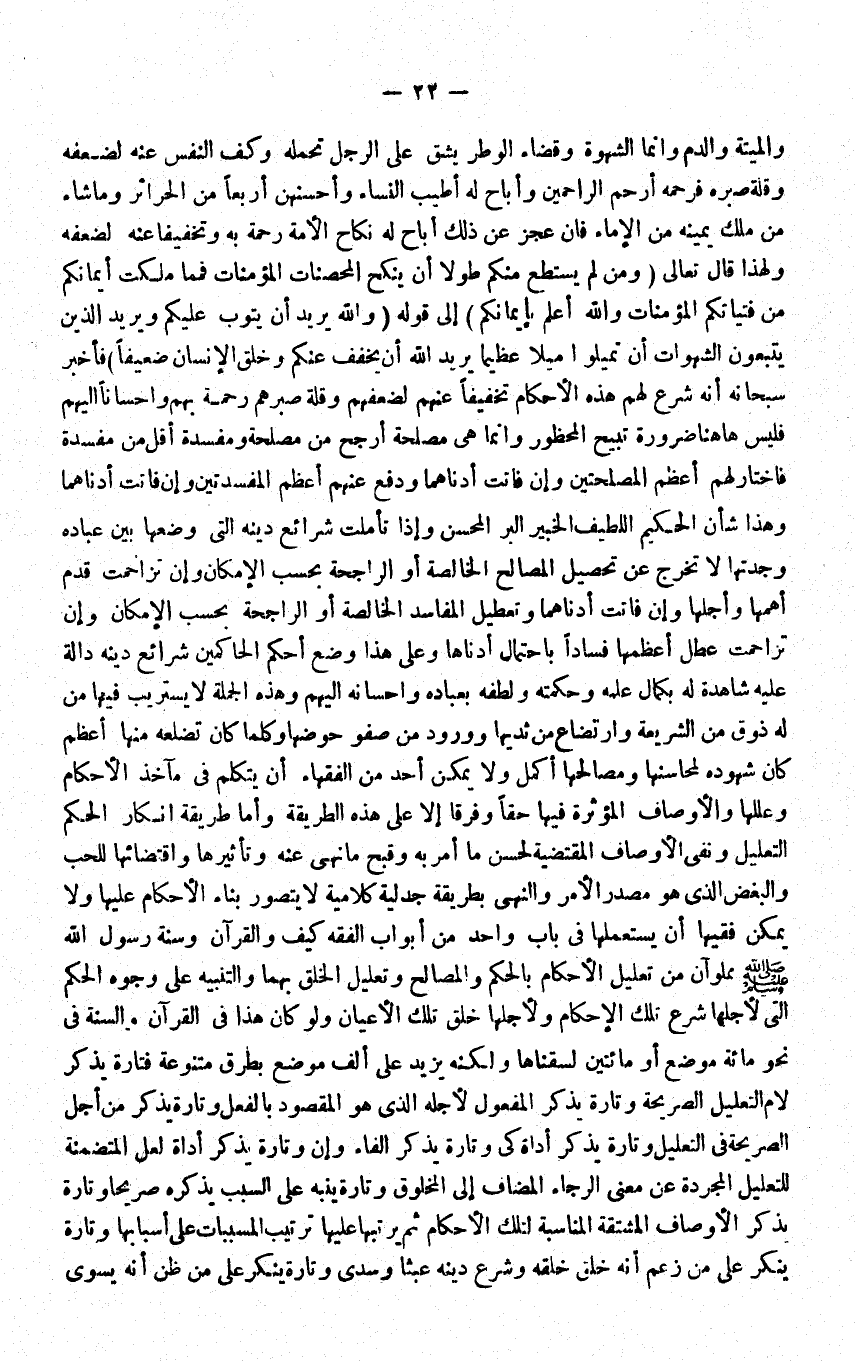 وَالْميتَة وَالدَّم وَإِنَّمَا الشَّهْوَة وَقَضَاء الوطر يشق على الرجل تحمله وكف النَّفس عَنهُ لضَعْفه وَقلة صبره فرحمه أرْحم الرَّاحِمِينَ وأباح لَهُ أطيب النِّسَاء وأحسنهن أَرْبعا من الْحَرَائِر وَمَا شَاءَ من ملك يَمِينه من الْإِمَاء فَإِن عجز عَن ذَلِك أَبَاحَ لَهُ نِكَاح الْأمة رَحْمَة بِهِ وتخفيفا عَنهُ لضَعْفه وَلِهَذَا قَالَ تَعَالَى وَمن لم يسْتَطع مِنْكُم طولا أَن ينْكح الْمُحْصنَات الْمُؤْمِنَات فمما ملكت أَيْمَانكُم من فَتَيَاتكُم الْمُؤْمِنَات وَالله أعلم بإيمانكم إِلَى قَوْله {وَالله يُرِيد أَن يَتُوب عَلَيْكُم وَيُرِيد الَّذين يتبعُون الشَّهَوَات أَن تميلوا ميلًا عَظِيما يُرِيد الله أَن يُخَفف عَنْكُم وَخلق الْإِنْسَان ضَعِيفا} فَأخْبر سُبْحَانَهُ أَنه شرع لَهُم هَذِه الْأَحْكَام تَخْفِيفًا عَنْهُم لضعفهم وَقلة صبرهم رَحْمَة بهم وإحسانا إِلَيْهِم فَلَيْسَ هَاهُنَا ضَرُورَة تبيح الْمَحْظُور وَإِنَّمَا هِيَ مصلحَة أرجح من مصلحَة ومفسدة أقل من مفْسدَة فَاخْتَارَ لَهُم أعظم المصلحتين وَأَن فَاتَت أدناهما وَدفع عَنْهُم أعظم المفسدتين وَأَن فَاتَت أدناهما وَهَذَا شَأْن الْحَكِيم اللَّطِيف الْخَبِير الْبر المحسن وَإِذا تَأَمَّلت شرائع دينه الَّتِي وَضعهَا بَين عباده وَجدتهَا لَا تخرج عَن تَحْصِيل الْمصَالح الْخَالِصَة أَو الراجحة بِحَسب الْإِمْكَان وان تزاحمت قدم أهمها وأجلها وَأَن فَاتَت أدناهما وتعطيل الْمَفَاسِد الْخَالِصَة أَو الراجحة بِحَسب الْإِمْكَان وَأَن تزاحمت عطل أعظمها فَسَادًا بِاحْتِمَال أدناهما وعَلى هَذَا وضع أحكم الْحَاكِمين شرائع دينه دَالَّة عَلَيْهِ شاهدة لَهُ بِكَمَال علمه وحكمته ولطفه بعباده وإحسانه إِلَيْهِم وَهَذِه الْجُمْلَة لَا يستريب فِيهَا من لَهُ ذوق من الشَّرِيعَة وارتضاع من ثديها وورود من صفو حَوْضهَا وَكلما كَانَ تضلعه مِنْهَا أعظم كَانَ شُهُوده لمحاسنها ومصالحها أكمل وَلَا يُمكن أحد من الْفُقَهَاء أَن يتَكَلَّم فِي مآخذ الْأَحْكَام وعللها والأوصاف المؤثرة فِيهَا حَقًا وفرقا إِلَّا على هَذِه الطَّرِيقَة وَأما طَريقَة إِنْكَار الحكم التَّعْلِيل وَنفي الْأَوْصَاف الْمُقْتَضِيَة لحسن مَا أَمر بِهِ وقبح مَا نهى عَنهُ وتأثيرها واقتضائها للحب والبغض الَّذِي هُوَ مصدر الْأَمر وَالنَّهْي بطريقة جدلية كلامية لَا يتَصَوَّر بِنَاء الْأَحْكَام عَلَيْهَا وَلَا يُمكن فَقِيها أَن يستعملها فِي بَاب وَاحِد من أَبْوَاب الْفِقْه كَيفَ وَالْقُرْآن وَسنة رَسُول الله مملوآن من تَعْلِيل الْأَحْكَام بالحكم والمصالح وتعليل الْخلق بهما والتنبيه على وُجُوه الحكم الَّتِي لأَجلهَا شرع تِلْكَ الإحكام ولأجلها خلق تِلْكَ الْأَعْيَان وَلَو كَانَ هَذَا فِي الْقُرْآن وَالسّنة فِي نَحْو مائَة مَوضِع أَو مِائَتَيْنِ لسقناها وَلكنه يزِيد على ألف مَوضِع بطرق متنوعة فَتَارَة يذكر لَام التَّعْلِيل الصَّرِيحَة وَتارَة يذكر الْمَفْعُول لأَجله الَّذِي هُوَ الْمَقْصُود بِالْفِعْلِ وَتارَة يذكر من أجل الصَّرِيحَة فِي التَّعْلِيل وَتارَة يذكر أَدَاة كي وَتارَة يذكر الْفَاء وَأَن وَتارَة يذكر أَدَاة لَعَلَّ المتضمنة للتَّعْلِيل الْمُجَرَّدَة عَن معنى الرَّجَاء الْمُضَاف إِلَى الْمَخْلُوق وَتارَة يُنَبه على السَّبَب يذكرهُ صَرِيحًا وَتارَة يذكر الْأَوْصَاف المشتقة الْمُنَاسبَة لتِلْك الْأَحْكَام ثمَّ يرتبها عَلَيْهَا تَرْتِيب المسببات على أَسبَابهَا وَتارَة يُنكر على من زعم أَنه خلق خلقه وَشرع دينه عَبَثا وسدى وَتارَة يُنكر على من ظن أَنه يسوى
