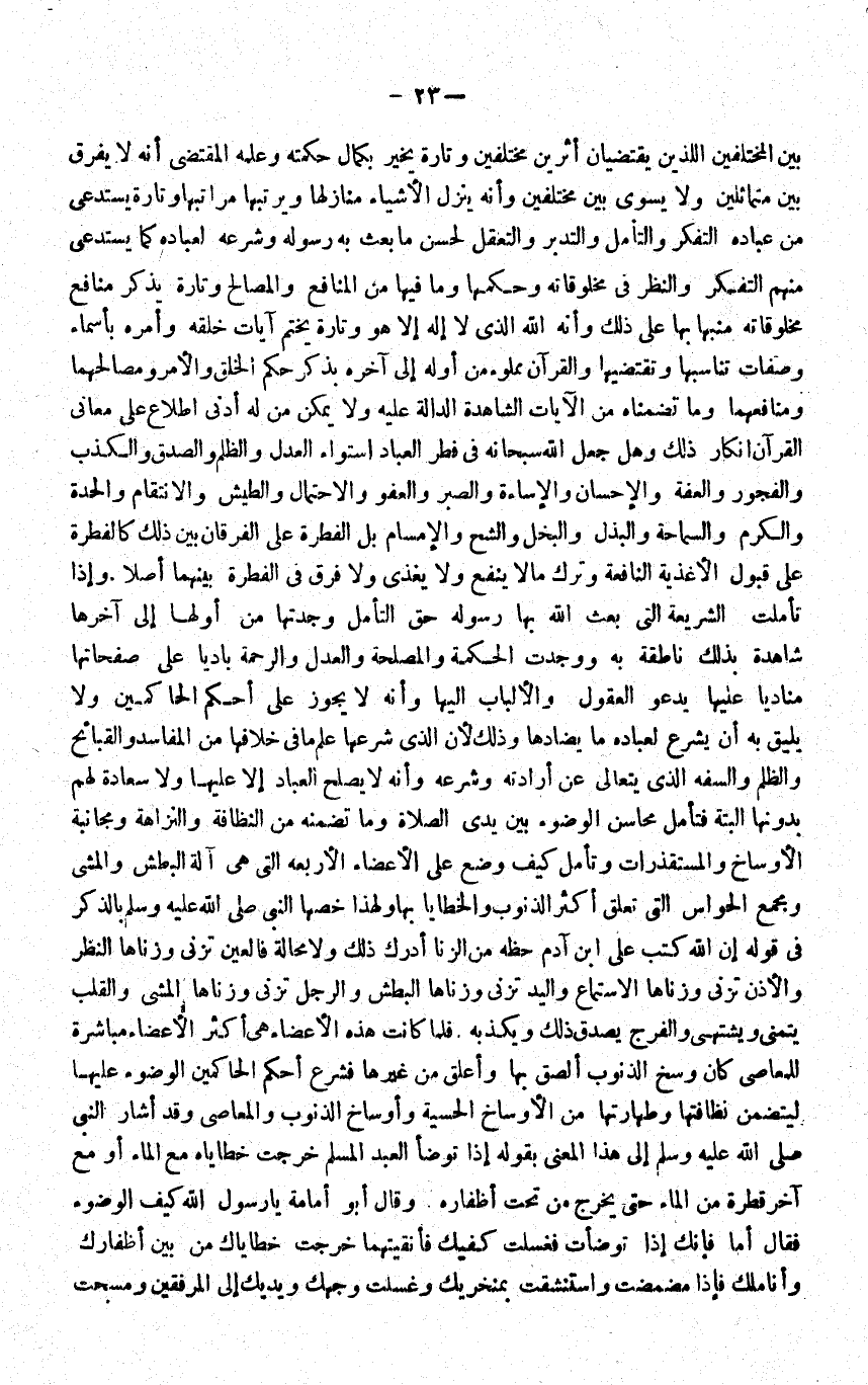 بَين الْمُخْتَلِفين اللَّذين يقتضيان أثرين مُخْتَلفين وَتارَة يُخَيّر بِكَمَال حكمته وَعلمه الْمُقْتَضى أَنه لَا يفرق بَين متماثلين وَلَا يسوى بَين مُخْتَلفين وَأَنه ينزل الْأَشْيَاء منازلها ويرتبها مراتبها وَتارَة يستدعى من عباده التفكر والتأمل والتدبر والتعقل لحسن مَا بعث بِهِ رَسُوله وشرعه لِعِبَادِهِ كَمَا يستدعى مِنْهُم التفكر وَالنَّظَر فِي مخلوقاته وَحكمهَا وَمَا فِيهَا من الْمَنَافِع والمصالح وَتارَة يذكر مَنَافِع مخلوقاته منبها بهَا على ذَلِك وَأَنه الله الَّذِي لَا إِلَه إِلَّا هُوَ وَتارَة يخْتم آيَات خلقه وَأمره بأسماء وصفات تناسبها وتقتضيها وَالْقُرْآن مَمْلُوء من أَوله إِلَى آخِره بِذكر حكم الْخلق وَالْأَمر ومصالحهما ومنافعهما وَمَا تضمناه من الْآيَات الشاهدة الدَّالَّة عَلَيْهِ وَلَا يُمكن من لَهُ أدني اطلَاع على مَعَاني الْقُرْآن إِنْكَار ذَلِك وَهل جعل الله سُبْحَانَهُ فِي فطر الْعباد اسْتِوَاء الْعدْل وَالظُّلم والصدق وَالْكذب والفجور والعفة وَالْإِحْسَان والإساءة وَالصَّبْر وَالْعَفو وَالِاحْتِمَال والطيش والانتقام والحدة وَالْكَرم والسماحة والبذل وَالْبخل وَالشح والإمسام بل الْفطْرَة على الْفرْقَان بَين ذَلِك كالفطرة على قبُول الأغذية النافعة وَترك مَالا ينفع وَلَا يغذي وَلَا فرق فِي الْفطْرَة بَينهمَا أصلا وَإِذا تَأَمَّلت الشَّرِيعَة الَّتِي بعث الله بهَا رَسُوله حق التَّأَمُّل وَجدتهَا من أَولهَا إِلَى آخرهَا شاهدة بذلك ناطقة بِهِ وَوجدت الْحِكْمَة والمصلحة وَالْعدْل وَالرَّحْمَة باديا على صفحاتها مناديا عَلَيْهَا يَدْعُو الْعُقُول والألباب إِلَيْهَا وَأَنه لَا يجوز على أحكم الْحَاكِمين وَلَا يَلِيق بِهِ أَن يشرع لِعِبَادِهِ مَا يضادها وَذَلِكَ لِأَن الَّذِي شرعها علم مَا فِي خلَافهَا من الْمَفَاسِد والقبائح وَالظُّلم والسفه الَّذِي يتعالى عَن أَرَادَتْهُ وشرعه وَأَنه لَا يصلح الْعباد إِلَّا عَلَيْهَا وَلَا سَعَادَة لَهُم بِدُونِهَا الْبَتَّةَ فَتَأمل محَاسِن الْوضُوء بَين يَدي الصَّلَاة وَمَا تضمنه من النَّظَافَة والنزاهة ومجانبة الأوساخ والمستقذرات وَتَأمل كَيفَ وضع على الْأَعْضَاء الْأَرْبَعَة الَّتِي هِيَ آلَة الْبَطْش وَالْمَشْي وَمجمع الْحَواس الَّتِي تعلق أَكثر الذُّنُوب والخطايا بهَا وَلِهَذَا خصها النَّبِي صلى الله علية وَسلم بِالذكر فِي قَوْله إِن الله كتب على ابْن آدم حَظه من الزِّنَا أدْرك ذَلِك وَلَا محَالة فالعين تَزني وزناها النّظر وَالْأُذن تَزني وزناها الِاسْتِمَاع وَالْيَد تَزني وزناها الْبَطْش وَالرجل تَزني وزناها الْمَشْي وَالْقلب يتمني ويشتهي والفرج يصدق ذَلِك ويكذبه فَلَمَّا كَانَت هَذِه الْأَعْضَاء هِيَ أَكثر الْأَعْضَاء مُبَاشرَة للمعاصي كَانَ وسخ الذُّنُوب ألصق بهَا وأعلق من غَيرهَا فشرع أحكم الْحَاكِمين الْوضُوء عَلَيْهَا ليتضمن نظافتها وطهارتها من الأوساخ الحسية وأوساخ الذُّنُوب والمعاصي وَقد أَشَارَ النَّبِي إِلَى هَذَا الْمَعْنى بقوله إِذا تَوَضَّأ العَبْد الْمُسلم خرجت خطاياه مَعَ المَاء أَو مَعَ آخر قَطْرَة من المَاء حَتَّى يخرج من تَحت أَظْفَاره وَقَالَ أَبُو إِمَامَة يَا رَسُول الله كَيفَ الْوضُوء فَقَالَ أما فَإنَّك إِذا تَوَضَّأت فغسلت كفيك فأنقيتهما خرجت خطاياك من بَين أظفارك وَأَنا ملك فَإِذا مضمضت واستنشقت بمنخريك وغسلت وَجهك ويديك إِلَى الْمرْفقين ومسحت