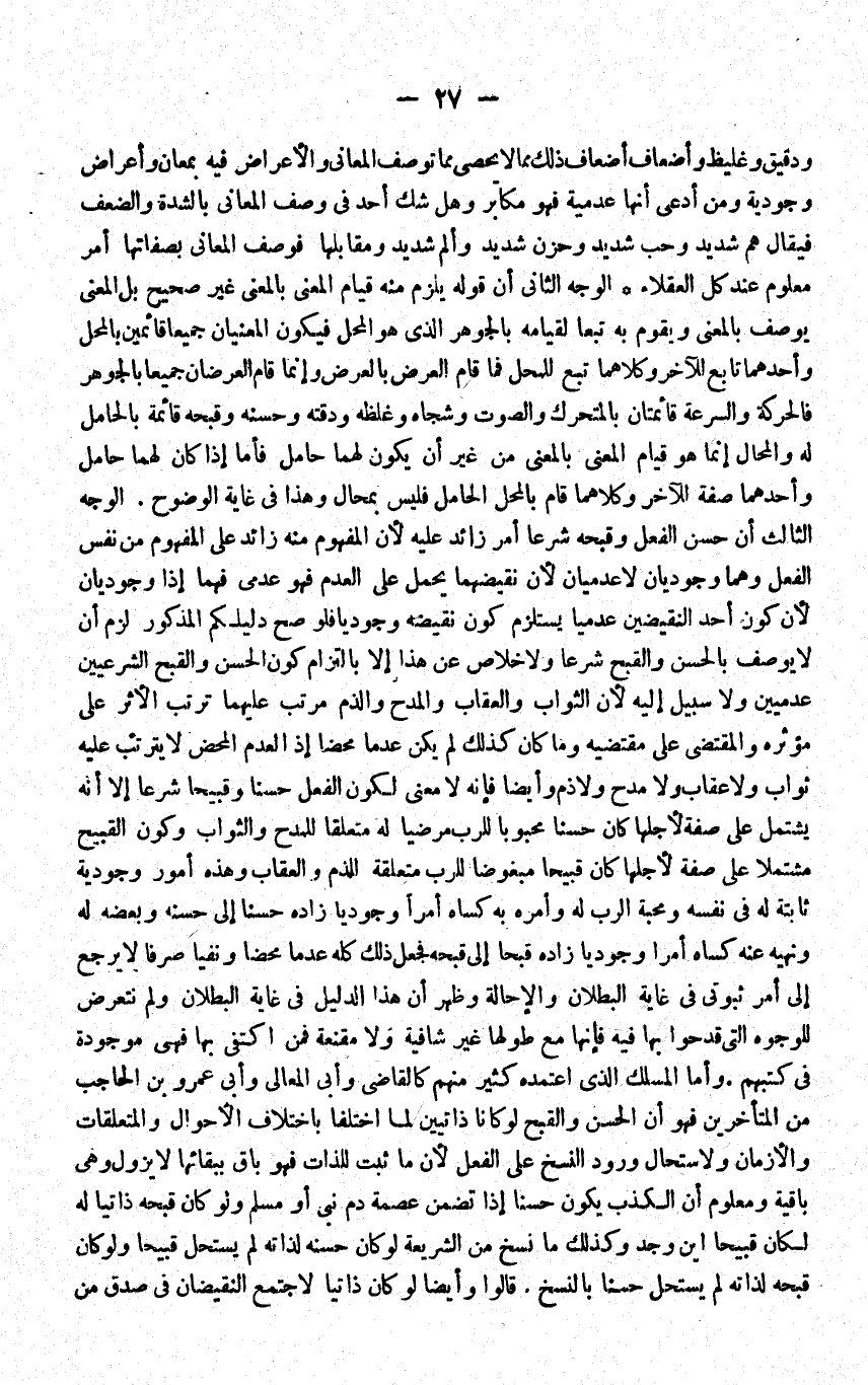 الْوَجْه الثَّالِث أَن حسن الْفِعْل وقبحه شرعا أَمر زَائِد عَلَيْهِ لِأَن الْمَفْهُوم مِنْهُ زَائِد على الْمَفْهُوم من نفس الْفِعْل وهما وجوديان لاعدميان لِأَن نقيضهما يحمل على الْعَدَم فَهُوَ عدمي فهما إِذا وجوديان لِأَن كَون أحد النقيضين عدميا يسْتَلْزم كَون نقيضه وجوديا فَلَو صَحَّ دليلكم الْمَذْكُور لزم أَن لَا يُوصف بالْحسنِ والقبح شرعا وَلَا خلاص عَن هَذَا إِلَّا بِالْتِزَام كَون الْحسن والقبح الشرعيين عدميين وَلَا سَبِيل إِلَيْهِ لِأَن الثَّوَاب وَالْعِقَاب والمدح والذم مُرَتّب عَلَيْهِمَا ترَتّب الآثر على مؤثره الْمُقْتَضى على مقتضيه وَمَا كَانَ كَذَلِك لم يكن عدما مَحْضا إِذْ الْعَدَم الْمَحْض لَا يَتَرَتَّب عَلَيْهِ ثَوَاب وَلَا عِقَاب وَلَا مدح وَلَا ذمّ وَأَيْضًا فَإِنَّهُ لَا معنى لكَون الْفِعْل حسنا وقبيحا شرعا إِلَّا أَنه يشْتَمل على صفة لأَجلهَا كَانَ حسنا محبوبا للرب مرضيا لَهُ مُتَعَلقا للمدح وَالثَّوَاب وَكَون الْقَبِيح مُشْتَمِلًا على صفة لأَجلهَا كَانَ قبيحا مبغوضا للرب مُتَعَلقَة للذم وَالْعِقَاب وَهَذِه أُمُور وجودية ثَابِتَة لَهُ فِي نَفسه ومحبة الرب لَهُ وَأمره بِهِ كَسَاه أمرا وجوديا زَاده حسنا إِلَى حسنه وَبَعضه لَهُ وَنَهْيه عَنهُ كَسَاه أمرا وجوديا زَاده قبحا إِلَى قبحه فَجعل ذَلِك كُله عدما مَحْضا ونفيا صرفا لَا يرجع إِلَى أَمر ثبوتي فِي غَايَة الْبطلَان والإحالة وَظهر والإحالة وَظهر أَن هَذَا الدَّلِيل فِي غَايَة الْبطلَان وَلم نتعرض للوجوه الَّتِي قَدَحُوا بهَا فِيهِ فَإِنَّهَا مَعَ طولهَا غير شافية وَلَا مقنعة فَمن اكْتفى بهَا فَهِيَ مَوْجُودَة فِي كتبهمْ وَأما المسلك الَّذِي اعْتَمدهُ كثير مِنْهُم كَالْقَاضِي وَأبي الْمَعَالِي وَأبي عَمْرو بن الْحَاجِب من الْمُتَأَخِّرين فَهُوَ أَن الْحسن والقبح لَو كَانَا ذاتيين لما اخْتلفَا باخْتلَاف الْأَحْوَال والمتعلقات والأزمان وَلَا ستحال وُرُود النّسخ على الْفِعْل لِأَن مَا ثَبت للذات فَهُوَ بَاقٍ ببقائها لَا يَزُول وَهِي بَاقِيَة وَمَعْلُوم أَن الْكَذِب يكون حسنا إِذا تضمن عصمَة دم نَبِي أَو مُسلم وَلَو كَانَ قبحه ذاتيا لَهُ لَكَانَ قبيحا ايْنَ وجد وَكَذَلِكَ مَا نسخ من الشَّرِيعَة لَو كَانَ حسنه لذاته لم يسْتَحل قبيحا وَلَو كَانَ قبحه لذاته لم يسْتَحل حسنا بالنسخ قَالُوا وَأَيْضًا لَو كَانَ ذاتيا لاجتمع النقيضان فِي صدق من