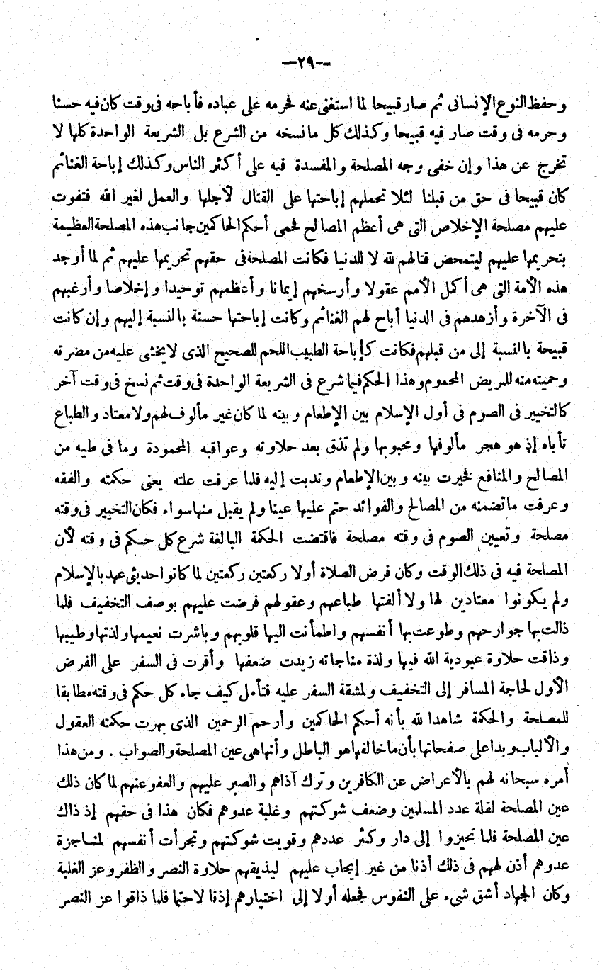 وَحفظ النَّوْع الإنساني ثمَّ صَار قبيحا لما اسْتغنى عَنهُ فحرمه على عباده فأباحه فِي وَقت كَانَ فِيهِ حسنا وَحرمه فِي وَقت صَار فِيهِ قبيحا وَكَذَلِكَ كل مَا نسخه من الشَّرْع بل الشَّرِيعَة الْوَاحِدَة كلهَا لَا تخرج عَن هَذَا وَإِن خَفِي وَجه الْمصلحَة والمفسدة فِيهِ على أَكثر النَّاس وَكَذَلِكَ إِبَاحَة الْغَنَائِم كَانَ قبيحا فِي حق من قبلنَا لِئَلَّا تحملهم إباحتها على الْقِتَال لأَجلهَا وَالْعَمَل لغير الله فتفوت عَلَيْهِم مصلحَة الْإِخْلَاص الَّتِي هِيَ أعظم الْمصَالح فحمى أحكم الْحَاكِمين جَانب هَذِه الْمصلحَة الْعَظِيمَة بتحريمها عَلَيْهِم ليتمحض قِتَالهمْ لله لَا للدنيا فَكَانَت الْمصلحَة فِي حَقهم تَحْرِيمهَا عَلَيْهِم ثمَّ لما أوجد هَذِه الْأمة الَّتِي هِيَ أكمل الْأُمَم عقولا وأرسخهم إِيمَانًا وأعظمهم توحيدا وإخلاصا وأرغبهم فِي الْآخِرَة وأزهدهم فِي الدُّنْيَا أَبَاحَ لَهُم الْغَنَائِم وَكَانَت إباحتها حَسَنَة بِالنِّسْبَةِ إِلَيْهِم وَإِن كَانَت قبحة بِالنِّسْبَةِ إِلَى من قبلهم فَكَانَت كإباحة الطَّبِيب اللَّحْم للصحيح الَّذِي لَا يخْشَى عَلَيْهِ من مضرته وحميته مِنْهُ للْمَرِيض المحموم وَهَذَا الحكم فِيمَا شرع فِي الشَّرِيعَة الْوَاحِدَة فِي وَقت ثمَّ نسخ فِي وَقت آخر كالتخيير فِي الصَّوْم فِي أول الْإِسْلَام بَين الْإِطْعَام وَبَينه لما كَانَ غير مألوف لَهُم وَلَا مُعْتَاد والطباع تأباه إِذْ هُوَ هجر مألوفها ومحبوبها وَلم تذق بعد حلاوته وعواقبه المحمودة وَمَا فِي طيه من الْمصَالح وَالْمَنَافِع فخيرت بَينه وَبَين الْإِطْعَام وندبت إِلَيْهِ فَلَمَّا عرفت علته يَعْنِي حكمته وَالْفِقْه وَعرفت مَا تضمنه من الْمصَالح والفوائد حتم عَلَيْهَا عينا وَلم يقبل مِنْهَا سَوَاء فَكَانَ التَّخْيِير فِي وقته مصلحَة وَتَعْيِين الصَّوْم فِي وقته مصلحَة فاقتضت الْحِكْمَة الْبَالِغَة شرع كل حكم فِي وقته لِأَن الْمصلحَة فِيهِ فِي ذَلِك الْوَقْت وَكَانَ فرض الصَّلَاة أَولا رَكْعَتَيْنِ رَكْعَتَيْنِ لما كَانُوا حَدِيثي عهد بِالْإِسْلَامِ وَلم يَكُونُوا معتادين لَهَا وَلَا ألفتها طباعهم وعقولهم فرضت عَلَيْهِم بِوَصْف التَّخْفِيف فَلَمَّا ذالت بهَا جوارحهم وطوعت بهَا أنفسهم وأطمأنت اليها قُلُوبهم وباشرت نعيمها لذتها وطيبها وذاقت حلاوة عبودية الله فِيهَا وَلَذَّة مناجاته زيدت ضعفها وأقرت فِي السّفر على الْفَرْض الأول لحَاجَة الْمُسَافِر إِلَى التَّخْفِيف ولمشقة السّفر عَلَيْهِ فَتَأمل كَيفَ جَاءَ كل حكم فِي وقته مطابقا للْمصْلحَة وَالْحكمَة شَاهدا لله بِأَنَّهُ أحكم الْحَاكِمين وأرحم الرَّاحِمِينَ الَّذِي بهرت حكمته الْعُقُول والألباب وبدا على صفحاتها بِأَن مَا خالفها هُوَ الْبَاطِل وَأَنَّهَا هِيَ عين الْمصلحَة وَالصَّوَاب وَمن هَذَا أمره سُبْحَانَهُ لَهُم بالأعراض عَن الْكَافرين وَترك آذاهم وَالصَّبْر عَلَيْهِم وَالْعَفو عَنْهُم لما كَانَ ذَلِك عين الْمصلحَة لقلَّة عدد الْمُسلمين وَضعف شوكتهم وَغَلَبَة عدوهم فَكَانَ هَذَا فِي حَقهم إِذْ ذَاك عين الْمصلحَة فَلَمَّا تحيزوا إِلَى دَار وَكثر عَددهمْ وقويت شوكتهم وتجرأت أنفسهم لمناجزة عدوهم أذن لَهُم فِي ذَلِك أذنا من غير إِيجَاب عَلَيْهِم ليذيقهم حلاوة النَّصْر وَالظفر وَعز الْغَلَبَة وَكَانَ الْجِهَاد أشق شَيْء على النُّفُوس فَجعله أَولا إِلَى اختيارهم إِذْنا لاحتما فَلَمَّا ذاقوا عز النَّصْر