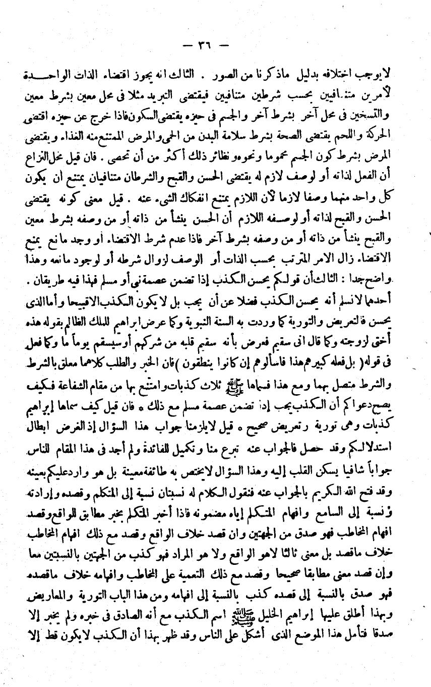 لَا يُوجب اختلافه بِدَلِيل مَا ذكرنَا من الصُّور الثَّالِث انه يجوز اقْتِضَاء الذَّات الْوَاحِدَة لأمرين متنافيين بِحَسب شرطين متنافيين فيقتضى التبريد مثلا فِي مَحل معِين بِشَرْط معِين والتسخين فِي مَحل آخر بِشَرْط آخر والجسم فِي حيزه يَقْتَضِي السّكُون فَإِذا خرج عَن حيزه اقْتضى الْحَرَكَة وَاللَّحم يَقْتَضِي الصِّحَّة بِشَرْط سَلامَة الْبدن من الْحمى وَالْمَرَض الْمُمْتَنع مِنْهُ الْغذَاء وَيَقْتَضِي الْمَرَض بِشَرْط كَون الْجِسْم محموما وَنَحْوه ونظائر ذَلِك أَكثر من أَن تحصى فَإِن قيل مَحل النزاع أَن الْفِعْل لذاته أَو لوصف لَازم لَهُ يَقْتَضِي الْحسن والقبح والشرطان متنافيان يمْتَنع أَن يكون كل وَاحِد مِنْهُمَا وَصفا لَازِما لِأَن اللَّازِم يمْتَنع انفكاك الشَّيْء عَنهُ قيل معنى كَونه يَقْتَضِي الْحسن والقبح لذاته أَو لوصفه اللَّازِم أَن الْحسن ينشأ من ذَاته أَو من وَصفه بِشَرْط معِين والقبح ينشأ من ذَاته أَو من وَصفه بِشَرْط آخر فَإِذا عدم شَرط الِاقْتِضَاء أَو وجد مَانع يمْنَع الِاقْتِضَاء زَالَ الْأَمر الْمُتَرَتب بِحَسب الذَّات أَو الْوَصْف لزوَال شَرطه أَو لوُجُود مانعه وَهَذَا وَاضح جدا: الثَّالِث أَن قَوْلكُم يحسن الْكَذِب إِذا تضمن عصمَة نبى أَو مُسلم فَهَذَا فِيهِ طَرِيقَانِ أَحدهمَا لَا نسلم أَنه يحسن الْكَذِب فضلا عنأن يجب بل لَا يكون الْكَذِب إِلَّا قبيحا وَأما الَّذِي يحسن فالتعريض والتورية كَمَا وَردت بِهِ السّنة النَّبَوِيَّة وكما عرض إِبْرَاهِيم للْملك الظَّالِم بقوله هَذِه أُخْتِي لزوجته وكما قَالَ أَنِّي سقيم فَعرض بِأَنَّهُ سقيم قلبه من شركهم أَو سيسقم يَوْمًا مَا وكما فعل فِي قَوْله بل فعله كَبِيرهمْ هَذَا فاسألوهم أَن كَانُوا ينطقون فَأن الْخَبَر والطلب كِلَاهُمَا مُعَلّق بِالشّرطِ وَالشّرط مُتَّصِل بهما وَمَعَ هَذَا فسماها ثَلَاث كذبات وَامْتنع بهَا من مقَام الشَّفَاعَة فَكيف يَصح دعواكم أَن الْكَذِب يجب إِذا تضمن عصمَة مُسلم مَعَ ذَلِك فَأن قيل كَيفَ سَمَّاهَا إِبْرَاهِيم كذبات وَهِي تورية وتعريض صَحِيح قيل لَا يلْزمنَا جَوَاب هَذَا السُّؤَال إِذا الْغَرَض أبطال استدلالكم وَقد حصل فَالْجَوَاب عَنهُ تبرع منا وتكميل للفائدة وَلم أجد فِي هَذَا الْمقَام للنَّاس جَوَابا شافيا يسكن الْقلب إِلَيْهِ وَهَذَا السُّؤَال لَا يخْتَص بِهِ طَائِفَة مُعينَة بل هُوَ وَارِد عَلَيْكُم بِعَيْنِه وَقد فتح الله الْكَرِيم بِالْجَوَابِ عَنهُ فَنَقُول الْكَلَام لَهُ نسبتان نِسْبَة إِلَى الْمُتَكَلّم وقصده وإرادته وَنسبَة إِلَى السَّامع وإفهام الْمُتَكَلّم إِيَّاه مضمونه فَإِذا أخبر الْمُتَكَلّم بِخَبَر مُطَابق للْوَاقِع وَقصد إفهام الْمُخَاطب فَهُوَ صدق من الْجِهَتَيْنِ وَأَن قصد خلاف الْوَاقِع وَقصد مَعَ ذَلِك إفهام الْمُخَاطب خلاف مَا قصد بل معنى ثَالِثا لَا هُوَ الْوَاقِع وَلَا هُوَ المُرَاد فَهُوَ كذب من الْجِهَتَيْنِ بالنسبتين مَعًا وَإِن قصد معنى مطابقا صَحِيحا وَقصد مَعَ ذَلِك التعمية على الْمُخَاطب وإفهامه خلاف مَا قَصده فَهُوَ صدق بِالنِّسْبَةِ إِلَى قَصده كذب بِالنِّسْبَةِ إِلَى إفهامه وَمن هَذَا الْبَاب التورية والمعاريض وَبِهَذَا أطلق عَلَيْهَا إِبْرَاهِيم الْخَلِيل عَلَيْهِ السَّلَام اسْم الْكَذِب مَعَ أَنه الصَّادِق فِي خَبره وَلم يخبر إِلَّا صدقا فَتَأمل هَذَا الْموضع الَّذِي أشكل على النَّاس وَقد ظهر بِهَذَا أَن الْكَذِب لَا يكون قطّ إِلَّا