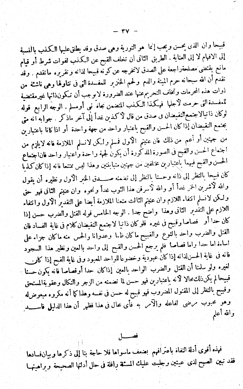 قبيحا وَأَن الَّذِي يحسن وَيجب إِنَّمَا هُوَ التورية وَهِي صدق وَقد يُطلق عَلَيْهَا الْكَذِب بِالنِّسْبَةِ إِلَى الإفهام لَا إِلَى الْعِنَايَة الطَّرِيق الثَّانِي ان تخلف الْقبْح عَن الْكَذِب لفَوَات شَرط أَو قيام مَانع يَقْتَضِي مصلحَة رَاجِعَة على الصدْق لَا تخرجه عَن كَونه قبيحا لذاته وَتَقْرِيره مَا تقدم وَقد تقدم أَن الله سُبْحَانَهُ حرم الْميتَة وَالدَّم وَلحم الْخِنْزِير للمفسدة الَّتِي فِي تنَاولهَا وَهِي ناشئة من ذَوَات هَذِه الْمُحرمَات وتخلف التَّحْرِيم عَنْهَا عِنْد الضَّرُورَة لَا يُوجب أَن تكون ذَاتهَا غير مقتضية للمفسدة الَّتِي حرمت لأَجلهَا فَهَكَذَا الْكَذِب المتضمن نجاة نَبِي أَو مُسلم الْوَجْه الرَّابِع قَوْله لَو كَانَ ذاتيا لاجتمع النقيضان فِي صدق من قَالَ لأكذبن غَدا إِلَى آخر مَا ذكر جَوَابه أَنه مَتى يجْتَمع النقيضان إِذا كَانَ الْحسن والقبح بِاعْتِبَار وَاحِد من جِهَة وَاحِدَة أَو إِذا كَانَا باعتبارين من جِهَتَيْنِ أَو أَعم من ذَلِك فَإِن عنيتم الأول فَمُسلم وَلَكِن لَا نسلم الْمُلَازمَة فَإِنَّهُ لَا يلْزم من اجْتِمَاع الْحسن والقبح فِي الصُّورَة الْمَذْكُورَة أَن يكون لجِهَة وَاحِدَة وَاعْتِبَار وَاحِد فَإِن اجْتِمَاع الْحسن والقبح فيهمَا باعتبارين مُخْتَلفين من جِهَتَيْنِ متباينتين وَهَذَا لَيْسَ مُمْتَنعا فَإِنَّهُ إِذا كَانَ كذبا كَانَ قبيحا بِالنّظرِ إِلَى ذَاته وحسنا بِالنّظرِ إِلَى تضمنه صدق الْخَبَر الأول وَنَظِيره إِن يَقُول وَالله لأشربن الْخمر غَدا أَو وَالله لآسرقن هَذَا الثَّوْب غَدا وَنَحْوه وَأَن عنيتم الثَّانِي فَهُوَ حق وَلَكِن لَا نسلم انْتِفَاء اللَّازِم وَأَن عنيتم الثَّالِث منعنَا الْمُلَازمَة أَيْضا على التَّقْدِير الأول وَانْتِفَاء اللَّازِم على التَّقْدِير الثَّانِي وَهَذَا وَاضح جدا الْوَجْه الْخَامِس قَوْله الْقَتْل وَالضَّرْب حسن إِذا كَانَ حدا أَو قصاصا وقبيح فِي غَيره فَلَو كَانَ ذاتيا لاجتمع النقيضان كَلَام فِي غَايَة الْفساد فَإِن الْقَتْل وَالضَّرْب وَاحِد بالنوع والقبيح مَا كَانَ ظنا وعدوانا والحس مِنْهُ مَا كَانَ جَزَاء على إساءة أما حدا وَأما قصاصا فَلم يرجع الْحسن والقبح إِلَى وَاحِد بِالْعينِ وَنَظِير هَذَا السُّجُود فَإِنَّهُ فِي غَايَة الْحسن لذاته إِذا كَانَ عبودية وخضوعا للْوَاحِد المعبود وَفِي غَايَة الْقبْح إِذا كَانَ لغيره وَلَو سلمنَا أَن الْقَتْل وَالضَّرْب الْوَاحِد بِالْعينِ إِذا كَانَ حدا أَو قصاصا فَإِنَّهُ يكون حسنا قبيحا لم يكن ذَلِك محالا لِأَنَّهُ باعتبارين فَهُوَ حسن لما تضمنه من الزّجر والنكال وعقوبة الْمُسْتَحق وقبيح بِالنّظرِ إِلَى الْمَقْتُول الْمَضْرُوب فَهُوَ قَبِيح لَهُ حسن فِي نَفسه وَهَذَا كَمَا أَنه مَكْرُوه مبغوض لَهُ وَهُوَ مَحْبُوب مرضى لفَاعِله والآمر بِهِ فَأَي محَال فِي هَذَا فَظهر أَن هَذَا الدَّلِيل فَاسد وَالله أعلم