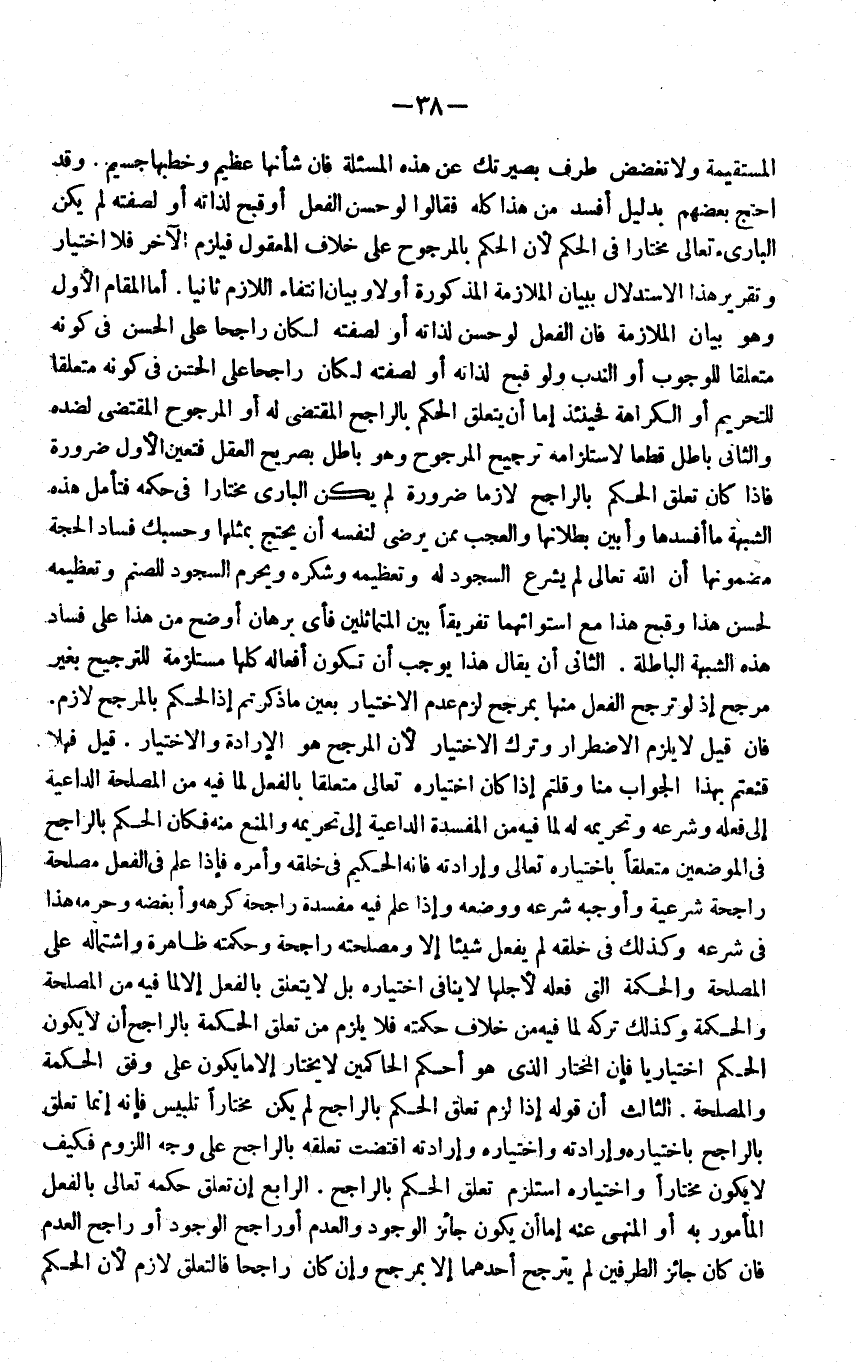 الثَّانِي أَن يُقَال هَذَا يُوجب أَن تكون أَفعاله كلهَا مستلزمة للترجيح بِغَيْر مُرَجّح إِذْ لَو ترجح الْفِعْل مِنْهَا بمرجح لزم عدم الِاخْتِيَار بِعَين مَا ذكرْتُمْ إِذا لحكم بالمرجح لَازم فَإِن قيل لَا يلْزم الِاضْطِرَار وَترك الِاخْتِيَار لِأَن الْمُرَجح هُوَ الْإِرَادَة وَالِاخْتِيَار قيل فَهَلا قنعتم بِهَذَا الْجَواب منا وقلتم إِذا كَانَ اخْتِيَاره تَعَالَى مُتَعَلقا بِالْفِعْلِ لما فِيهِ من الْمصلحَة الداعية إِلَى فعله وشرعه وتحريمه لَهُ مَا فِيهِ من الْمفْسدَة الداعية إِلَى تَحْرِيمه وَالْمَنْع مِنْهُ فَكَانَ الحكم بالراجح فِي الْمَوْضِعَيْنِ مُتَعَلقا بِاخْتِيَارِهِ تَعَالَى وإرادته فَإِنَّهُ الْحَكِيم فِي خلقه وَأمره فَإِذا علم فِي الْفِعْل مصلحَة راجحة شَرْعِيَّة وأوجبه شَرعه وَوَضعه وَإِذا علم فِيهِ مفْسدَة راجحة كرهه وأبغضه وَحرمه هَذَا فِي شَرعه وَكَذَلِكَ فِي خلقه لم يفعل شَيْئا إِلَّا ومصلحته راجحة وحكمته ظَاهِرَة واشتماله على الْمصلحَة وَالْحكمَة الَّتِي فعله لأَجلهَا لَا يُنَافِي اخْتِيَاره بل لَا يتَعَلَّق بِالْفِعْلِ إِلَّا لما فِيهِ من الْمصلحَة وَالْحكمَة وَكَذَلِكَ تَركه لما فِيهِ من خلاف حكمته فَلَا يلْزم من تعلق الْحِكْمَة بالراجح أَن لَا يكون الحكم اختياريا فَإِن الْمُخْتَار الَّذِي هُوَ أحكم الْحَاكِمين لَا يخْتَار إِلَّا مَا يكون على وفْق الْحِكْمَة والمصلحة
