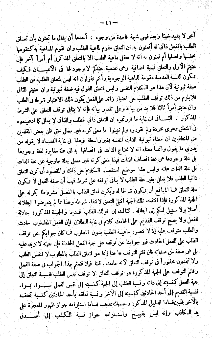 آخر لَا يُفِيد شَيْئا وَبعد فَهِيَ شُبْهَة فَاسِدَة من وُجُوه: أَحدهَا أَن يُقَال مَا تعنون بِأَن تعلق الطّلب بِالْفِعْلِ ذاتي لَهُ أتعنون بِهِ أَن التَّعَلُّق مقوم لماهية الطّلب وَأَن تقوم الْمَاهِيّة بِهِ كتقومها بجنسها وفصلها أم تعنون بِهِ أَنه لَا تعقل مَاهِيَّة الطّلب الا بالتعلق الْمَذْكُور أم أمرا آخر فَإِن عنيتم الأول والتعلق نِسْبَة إضافية وَهِي عدمية عنْدكُمْ لَا وجود لَهَا فِي الْأَعْيَان فَكيف تكون النِّسْبَة العدمية مقومة للماهية الوجودية وَأَنْتُم تَقولُونَ أَنه لَيْسَ لمتعلق الطّلب من الطّلب صفة ثبوتية لِأَن هَذَا هُوَ الْكَلَام النَّفْسِيّ وَلَيْسَ لمتعلق القَوْل فِيهِ صفة ثبوتية وَأَن عنيتم الثَّانِي فَلَا يلْزم من ذَلِك توقف الطّلب على اعْتِبَار زَائِد على الْفِعْل يكون ذَلِك الِاعْتِبَار شرطا فِي الطّلب وَأَن عنيتم أمرا ثَالِثا فَلَا بُد بَيَانه وعَلى تَقْدِير بَيَانه فَإِنَّهُ لَا يُنَافِي توقف التَّعَلُّق على الشَّرْط الْمَذْكُور الثَّانِي أَن غَايَة مَا قررتموه قررتموه أَن التَّعَلُّق ذاتي للطلب والذاتي لَا يُعلل كَمَا ادعيتموه فِي الْمنطق دَعْوَى مُجَرّدَة وَلم تقرروه وَلم تبينوا مَا معنى كَونه غير مُعَلل حَتَّى ظن بعض المقلدين من المنطقيين أَن مَعْنَاهُ ثبوتية الذَّات لنَفسِهِ بِغَيْر وَاسِطَة وَهَذَا فِي غَايَة الْفساد لَا يَقُوله من يدرى مَا يَقُول وَإِنَّمَا مَعْنَاهُ أَنه لَا تحْتَاج الذَّات فِي اتصافها بِهِ إِلَى عِلّة مُغَايرَة لعِلَّة وجودهَا بل عِلّة وجودهَا هِيَ عِلّة اتصاف الذَّات فَهَذَا معنى كَونه غير مُعَلل بعلة خارجية عَن عِلّة الذَّات بل عِلّة الذَّات علته وَلَيْسَ هَذَا مَوضِع استقصاء الْكَلَام على ذَلِك وَالْمَقْصُود أَن كَون التَّعَلُّق ذاتيا للطلب فَلَا يُعلل بِغَيْر عِلّة الطّلب لَا يُنَافِي توقفه على شَرط فَهَب أَن صفة الْفِعْل لَا تكون عِلّة للتعلق فَمَا الْمَانِع أَن تكون شرطا لَهُ وَيكون تعلق الطّلب بِالْفِعْلِ مَشْرُوطًا بِكَوْنِهِ على الْجِهَة الْمَذْكُورَة فَإِذا انْتَفَت تِلْكَ الْجِهَة انْتَفَى التَّعَلُّق لانْتِفَاء شَرطه وَهَذَا مِمَّا لم يتَعَرَّضُوا لبطلانه أصلا وَلَا سَبِيل لكم إِلَى أبطالة الثَّالِث أَن قَوْلك الطّلب قديم والجهة الْمَذْكُورَة حَادِثَة للْفِعْل وَلَا يَصح توقف الْقَدِيم على الْحَادِث كَلَام فِي غَايَة الْبطلَان فَإِن الْفِعْل الْمَطْلُوب حَادث والطلب مُتَوَقف عَلَيْهِ إِذْ لَا تتَصَوَّر مَاهِيَّة الطّلب بِدُونِ الْمَطْلُوب فَمَا كَانَ جوابكم عَن توقف الطّلب على الْفِعْل الْحَادِث فَهُوَ جَوَابنَا عَن توقفه على جِهَة الْفِعْل الْحَادِثَة فَإِن جِهَته لَا تزيد عَلَيْهِ بل هِيَ صفة من صِفَاته فَإِن قُلْتُمْ التَّوَقُّف هَاهُنَا إِنَّمَا هُوَ لتَعلق الطّلب بالمطلوب لَا لنَفس الطّلب وَلَا تَجِدُونَ محذورا فِي توقف التَّعَلُّق لِأَنَّهُ حَادث قُلْنَا فَهَلا قنعتم بِهَذَا الْجَواب فِي صفة الْفِعْل وقلتم التَّوَقُّف على الْجِهَة الْمَذْكُورَة هُوَ توقف التَّعَلُّق لَا توقف نفس الطّلب فنسبة التَّعَلُّق إِلَى جِهَة الْفِعْل كنسبته إِلَى ذَاته وَنسبَة الطّلب إِلَى الْجِهَة كنسبته إِلَى نفس الْفِعْل سَوَاء بِسَوَاء فنسبة الْقَدِيم إِلَى أحد الحادثين كنسبته إِلَى الآخر وَنسبَة تعلقه بِأحد الحادثين كنسبة تعلقه بِالْآخرِ فَتبين فَسَادًا الدَّلِيل الْمَذْكُور وحسبك بِمذهب فَسَادًا استلزامه جَوَاز ظُهُور المعجزة على يَد الْكَاذِب وَإنَّهُ لَيْسَ بقبيح واستلزامه جَوَاز نِسْبَة الْكَذِب إِلَى أصدق