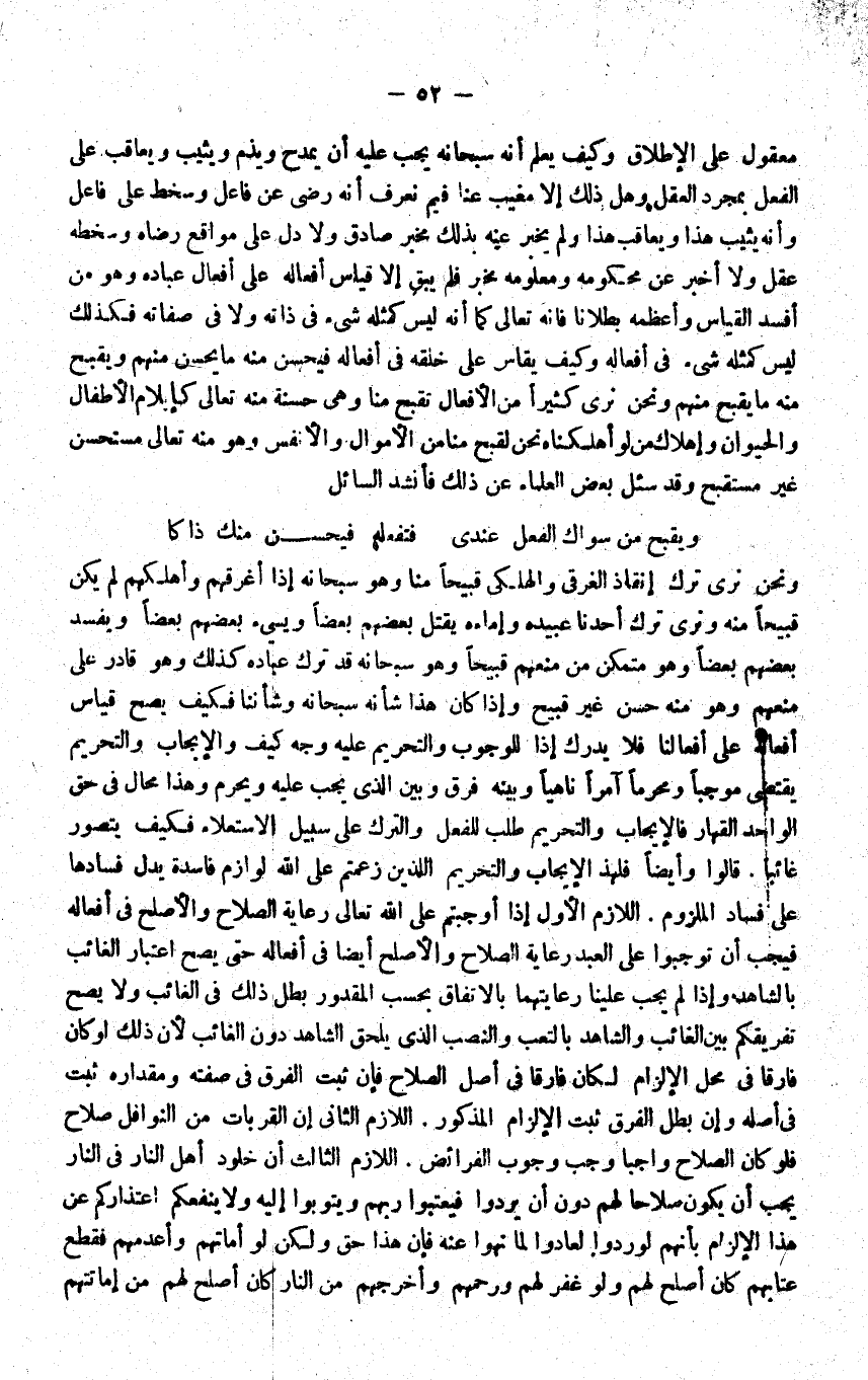 قَالُوا وَأَيْضًا فَلهَذَا الْإِيجَاب وَالتَّحْرِيم اللَّذين زعمتم على الله لَوَازِم فَاسِدَة يدل فَسَادهَا على فَسَاد الْمَلْزُوم اللَّازِم الأول إِذا أوجبتم على الله تَعَالَى رِعَايَة الصّلاح والأصلح فِي أَفعاله فَيجب أَن توجبوا على العَبْد رِعَايَة الصّلاح والأصلح أَيْضا فِي أَفعاله حَتَّى يَصح اعْتِبَار الْغَائِب بِالشَّاهِدِ وَإِذا لم يجب علينا رعايتهما بالِاتِّفَاقِ بِحَسب الْمَقْدُور بَطل ذَلِك فِي الْغَائِب وَلَا يَصح تفريقكم بَين الْغَائِب وَالشَّاهِد بالتعب وَالنّصب الَّذِي يلْحق الشَّاهِد دون الْغَائِب لآن ذَلِك لَو كَانَ فارقا فِي مَحل الْإِلْزَام لَكَانَ فارقا فِي أصل الصّلاح فَأن ثَبت الْفرق فِي صفته ومقداره ثَبت فِي أَصله وَأَن بَطل الْفرق ثَبت الْإِلْزَام الْمَذْكُور اللَّازِم الثَّانِي إِن القربات من النَّوَافِل صَلَاح فَلَو كَانَ الصّلاح وَاجِبا وَجب وجوب الْفَرَائِض اللَّازِم الثَّالِث أَن خُلُود أهل النَّار فِي النَّار يجب أَن يكون صلاحا لَهُم دون أَن يردوا فيعتبوا رَبهم ويتوبوا إِلَيْهِ وَلَا ينفعكم اعتذاركم عَن هَذَا الْإِلْزَام بِأَنَّهُم لوردوا لعادوا لما نهوا عَنهُ فَإِن هَذَا حق وَلَكِن لَو أماتهم وأعدمهم فَقطع عتابهم كَانَ أصلح لَهُم وَلَو غفر لَهُم ورحمهم وأخرجهم من النَّار كَانَ أصلح لَهُم من إماتتهم