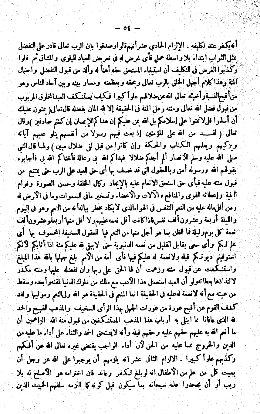 أَنه يكفر عِنْد تَكْلِيفه الْإِلْزَام الْحَادِي عشر أَنهم قَالُوا وَصَدقُوا بِأَن الرب تَعَالَى قَادر على التفضل بِمثل الثَّوَاب ابْتِدَاء بِلَا وَاسِطَة عمل فَأَي غَرَض لَهُ فِي تَعْرِيض الْعباد للبلوى والمشاق ثمَّ قَالُوا وكذبوا الْغَرَض فِي التَّكْلِيف أَن اسْتِيفَاء الْمُسْتَحق حَقه أهنا لَهُ وألذ من قبُول التفضل وَاحْتِمَال الْمِنَّة وَهَذَا كَلَام أَجْهَل الْخلق بالرب تَعَالَى وبحقه وبعظمته ومساو بَينه وَبَين أحاد النَّاس وَهُوَ من أقبح النِّسْبَة وأخبثه تَعَالَى الله عَن ضلالهم علوا كَبِيرا فَكيف يستنكف العَبْد الْمَخْلُوق المربوب من قبُول فضل الله تَعَالَى ومنته وَهل الْمِنَّة فِي الْحَقِيقَة إِلَّا الله المان بفضله قَالَ تَعَالَى يمنون عَلَيْك أَن أَسْلمُوا قل لَا تمنوا على إسلامكم بل الله يمن عَلَيْكُم إِن هدَاكُمْ للْإيمَان إِن كُنْتُم صَادِقين وَقَالَ تَعَالَى {لقد من الله على الْمُؤمنِينَ إِذْ بعث فيهم رَسُولا من أنفسهم يَتْلُو عَلَيْهِم آيَاته ويزكيهم وَيُعلمهُم الْكتاب وَالْحكمَة وَإِن كَانُوا من قبل لفي ضلال مُبين} وَلما قَالَ النَّبِي للْأَنْصَار ألم أَجِدكُم ضلالا فَهدَاكُم الله بِي وَعَالَة فَأَغْنَاكُمْ الله بِي فَأَجَابُوهُ بقَوْلهمْ الله وَرَسُوله أَمن وَيَا للعقول الَّتِي قد خسف بهَا أَي حق للْعَبد على الرب حَتَّى يمْتَنع من قبُول منته عَلَيْهِ فَبِأَي حق اسْتحق الْأَنْعَام عَلَيْهِ بالإيجاد وَكَمَال الْخلقَة وَحسن الصُّورَة وقوام البنية وإعطائه القوى وَالْمَنَافِع والآلات والأعضاء وتسخير مَا فِي السَّمَوَات وَمَا فِي الأَرْض لَهُ وَمن أقل مَاله عَلَيْهِ من النعم التنفس فِي الْهَوَاء الَّذِي لَا يكَاد يخْطر بِبَالِهِ أَنه من النعم وَهُوَ فِي الْيَوْم وَاللَّيْلَة أَرْبَعَة وَعِشْرُونَ ألف نفس فَإِذا كَانَت أقل نعمه عَلَيْهِم وَلَا أقل مِنْهَا أَرْبَعَة وَعِشْرُونَ ألف نعْمَة كل يَوْم وَلَيْلَة فَمَا الظَّن بِمَا هُوَ أجل مِنْهَا من النعم فيا للعقول السخيفة المخسوف بهَا أَي علم لكم وَأي سعي يُقَابل الْقَلِيل من نعمه الدُّنْيَوِيَّة حَتَّى لَا يبْقى لله عَلَيْكُم مِنْهُ إِذا أثابكم لأنكم استوفيتم ديونكم قبله وَلَا نعْمَة لَهُ عَلَيْكُم فِيهَا فَأَي أمة من الْأُمَم بلغ جهلها بِاللَّه هَذَا الْمبلغ واستنكفت عَن قبُول منته وَزَعَمت أَن لَهَا الْحق على رَبهَا وَأَن تفضله عَلَيْهَا ومنته مكدر لَا لتذاذها بعطائه وَلَو أَن العَبْد اسْتعْمل هَذَا الْأَدَب مَعَ ملك من مُلُوك الدُّنْيَا لمقته وأبعده وَسقط من عينه مَعَ أَنه لَا نعْمَة لَهُ عَلَيْهِ فِي الْحَقِيقَة إِنَّمَا الْمُنعم فِي الْحَقِيقَة هُوَ الله ولى النعم وموليها وَلَقَد كشف الْقَوْم عَن أقبح عَورَة من عورات الْجَهْل بِهَذَا الرَّأْي السخيف وَالْمذهب الْقَبِيح وَالْحَمْد لله الَّذِي عَافَانَا مِمَّا ابتلى بِهِ أَرْبَاب هَذَا الْمَذْهَب المستنكفين من قبُول منَّة الله الزاعمين أَن مَا أنعم الله بِهِ عَلَيْهِم حَقهم عَلَيْهِ وحقهم قبله وَأَنه لَا يسْتَحق الْحَمد وَالثنَاء على أَدَاء مَا عَلَيْهِ من الدّين وَالْخُرُوج مِمَّا عَلَيْهِ من الْحق لِأَن أَدَاء الْوَاجِب يَقْتَضِي غَيره تَعَالَى الله عَن إفكهم وكذبهم علوا كَبِيرا