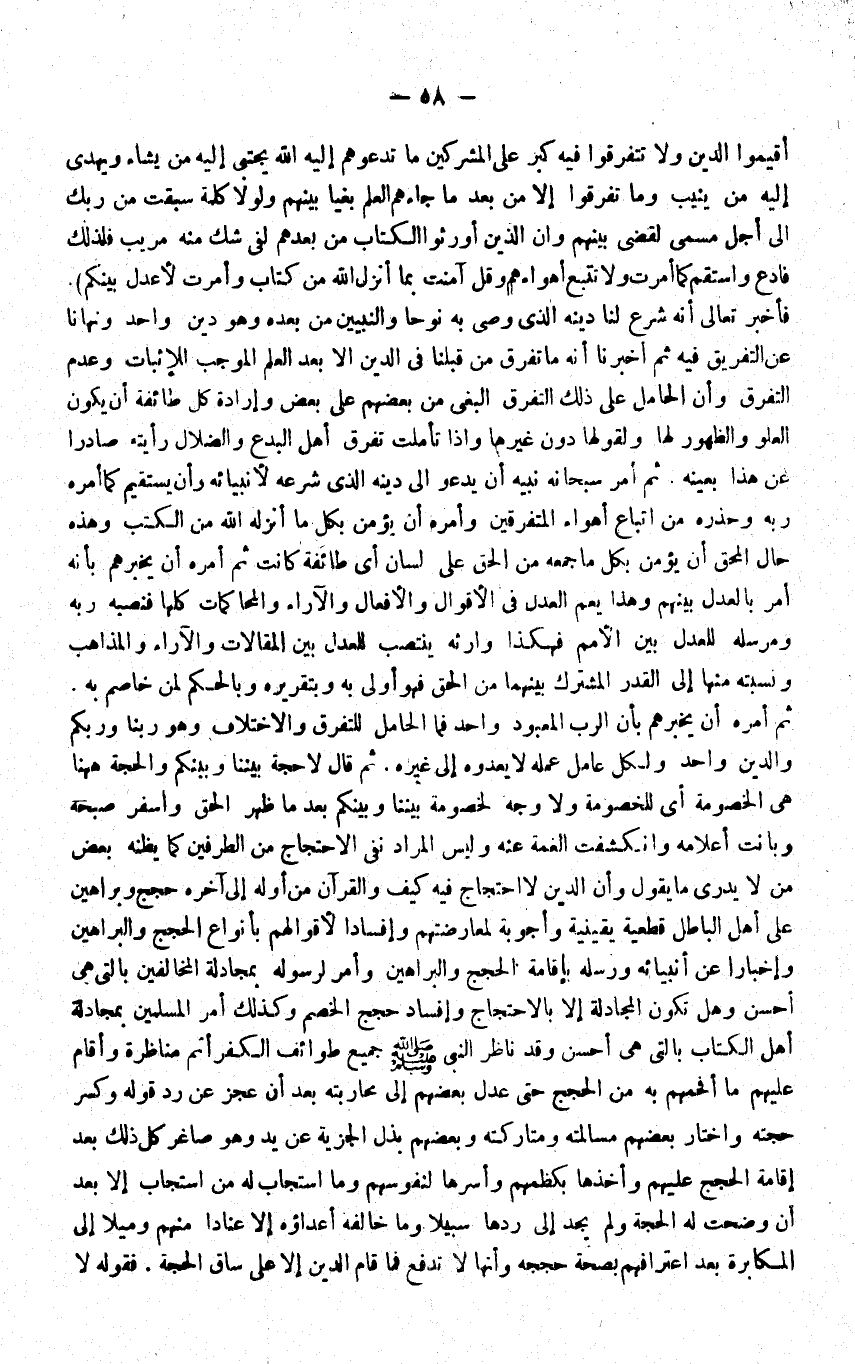 فَأخْبر تَعَالَى أَنه شرع لنا دينه الَّذِي وصّى بِهِ نوحًا والنبيين من بعده وَهُوَ دين وَاحِد ونهانا عَن التَّفْرِيق فِيهِ ثمَّ أخبرنَا أَنه مَا تفرق من قبلنَا فِي الدّين إِلَّا بعد الْعلم الْمُوجب للإثبات وَعدم التَّفَرُّق وَأَن الْحَامِل على ذَلِك التَّفَرُّق الْبَغي من بَعضهم على بعض وَإِرَادَة كل طَائِفَة أَن يكون الْعُلُوّ والظهور لَهَا ولقولها دون غَيرهَا وَإِذا تَأَمَّلت تفرق أهل الْبدع والضلال رَأَيْته صادرا عَن هَذَا بِعَيْنِه ثمَّ أَمر سُبْحَانَهُ نبيه أَن يَدْعُو إِلَى دينه الَّذِي شَرعه لأنبيائه وَأَن يَسْتَقِيم كَمَا أمره ربه وحذره من اتِّبَاع أهواء المتفرقين وَأمره أَن يُؤمن بِكُل مَا أنزلهُ الله من الْكتب وَهَذِه حَال المحق أَن يُؤمن بِكُل مَا جمعه من الْحق على لِسَان أَي طَائِفَة كَانَت ثمَّ أمره أَن يُخْبِرهُمْ بِأَنَّهُ أَمر بِالْعَدْلِ بَينهم وَهَذَا يعم الْعدْل فِي الْأَقْوَال وَالْأَفْعَال والآراء والمحاكمات كلهَا فنصبه ربه ومرسله للعدل بَين الْأُمَم فَهَكَذَا وَارثه ينْتَصب للعدل بَين المقالات والآراء والمذاهب ونسبته مِنْهَا إِلَى الْقدر الْمُشْتَرك بَينهمَا من الْحق فَهُوَ أولى بِهِ وبتقريره وبالحكم لمن خَاصم بِهِ ثمَّ أمره أَن يُخْبِرهُمْ بِأَن الرب المعبود وَاحِد فَمَا الْحَامِل للتفرق وَالِاخْتِلَاف وَهُوَ رَبنَا وربكم وَالدّين وَاحِد وَلكُل عَامل عمله لَا يعدوه إِلَى غَيره