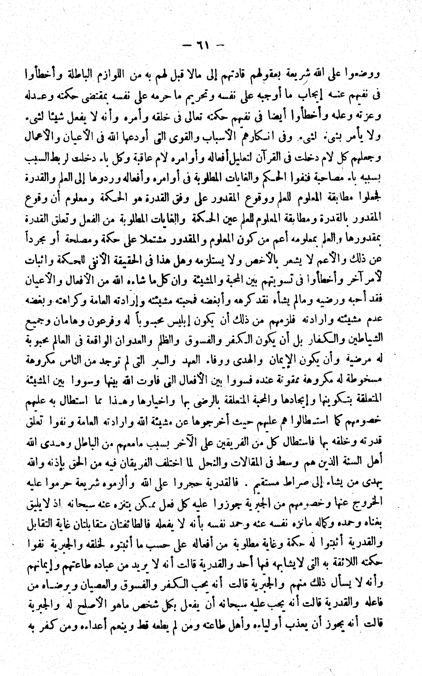 وَوَضَعُوا على الله شَرِيعَة بعقولهم قادتهم إِلَى مَالا قبل لَهُم بِهِ من اللوازم الْبَاطِلَة وأخطأوا فِي نفيهم عَنهُ إِيجَاب مَا أوجبه على نَفسه وَتَحْرِيم مَا حرمه على نَفسه بِمُقْتَضى حكمته وعدله وعزته وَعلمه وأخطاوا أَيْضا فِي نفسهم حكمته تَعَالَى فِي خلقه وَأمره وَأَنه لَا يفعل شَيْئا لشَيْء وَلَا يَأْمر بِشَيْء لشَيْء وَفِي إنكارهم الْأَسْبَاب والقوى الَّتِي أودعها الله فِي الْأَعْيَان والأعمال وجعلهم كل لَام دخلت فِي الْقُرْآن لتعليل أَفعاله وأوامره لَام عَاقِبَة وكل بَاء دخلت لربط السَّبَب بِسَبَبِهِ بَاء مصاحبة فنفوا الحكم والغايات الْمَطْلُوبَة فِي أوامره وأفعاله وردوها إِلَى الْعلم وَالْقُدْرَة فَجعلُوا مُطَابقَة الْمَعْلُوم للْعلم وَوُقُوع الْمَقْدُور على وفْق الْقُدْرَة هُوَ الْحِكْمَة وَمَعْلُوم أَن وُقُوع الْمَقْدُور بِالْقُدْرَةِ ومطابقة الْمَعْلُوم للْعلم عين الْحِكْمَة والغايات الْمَطْلُوبَة من الْفِعْل وَتعلق الْقُدْرَة بمقدورها وَالْعلم بمعلومة اعم من كَون الْمَعْلُوم والمقدور مُشْتَمِلًا على حِكْمَة ومصلحة أَو مُجَردا عَن ذَلِك والأعم لَا يشْعر بالأخص وَلَا يستلزمه وَهل هَذَا فِي الْحَقِيقَة الأنفي للحكمة وَإِثْبَات لأمر آخر وأخطاوا فِي تسويتهم بَين الْمحبَّة والمشيئة وَأَن كل مَا شاءه الله من الْأَفْعَال والأعيان فقد أحبه ورضيتة وَمَا لم يشأه نقد كرهه وأبغضه فمحبته مَشِيئَته وإرادته الْعَامَّة وكراهته وبغضه عدم مَشِيئَته وإرادته فلزمهم من ذَلِك أَن يكون إِبْلِيس محبوبا لَهُ وَفرْعَوْن وهامان وَجَمِيع الشَّيَاطِين وَالْكفَّار بل أَن يكون الْكفْر والفسوق وَالظُّلم والعدوان الْوَاقِعَة فِي الْعَالم محبوبة لَهُ مرضية وَأَن يكون الْإِيمَان وَالْهدى ووفاء الْعَهْد وَالْبر الَّتِي لم تُوجد من النَّاس مَكْرُوهَة مسخوطة لَهُ مَكْرُوهَة ممقوتة عِنْده فسووا بَين الْأَفْعَال الَّتِي فاوت الله بَينهَا وسووا بَين الْمَشِيئَة الْمُتَعَلّقَة بتكوينها وإيجادها والمحبة الْمُتَعَلّقَة بالرضى بهَا وأخيارها وَهَذَا مِمَّا استطال بِهِ عَلَيْهِم خصومهم كَمَا استطالوا هم عَلَيْهِم حَيْثُ أخرجوها عَن مَشِيئَة الله وإرادته الْعَامَّة وَنَفَوْا تعلق قدرته وخلقه بهَا فاستطال كل من الْفَرِيقَيْنِ على الآخر بِسَبَب مَا مَعَهم من الْبَاطِل وَهدى الله أهل السّنة الَّذين هم وسط فِي المقالات والنحل لما اخْتلف الْفَرِيقَانِ فِيهِ من الْحق بِإِذْنِهِ وَالله يهدى من يَشَاء إِلَى صِرَاط مُسْتَقِيم