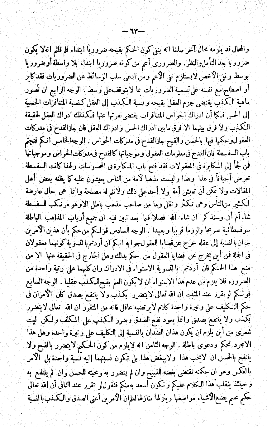 الْوَجْه الرَّابِع أَن نصور مَاهِيَّة الْكَذِب يَقْتَضِي جزم الْعقل بقبحه وَنسبَة الْكَذِب إِلَى الْعقل كنسبة المتنافرات الحسية إِلَى الْحس فَكَمَا أَن أَدْرَاك الْحَواس المتنافرات يَقْتَضِي نفرتها عَنْهَا فَكَذَلِك أَدْرَاك الْعقل لحقيقة الْكَذِب وَلَا فرق بَينهمَا إِلَّا فرق مَا بَين أَدْرَاك الْحس وأدراك الْعقل فَإِن جَازَ الْقدح فِي مدركات الْعُقُول وَحكمهَا فِيهَا بالْحسنِ والقبح جَازَ الْقدح فِي مدركات الْحَواس الْوَجْه الْخَامِس إِنَّكُم فتحتم بَاب السفسطة فَإِن الْقدح فِي مَعْلُومَات الْعُقُول وموجباتها كالقدح فِي مدركات الْحَواس وموجباتها فَمن لَجأ إِلَى المكابرة فِي المعقولات فقد فتح بَاب المكابرة فِي المحسوسات وَلِهَذَا كَانَت السفسطة تعرض أَحْيَانًا فِي هَذَا وَهَذَا وَلَيْسَت مذهبا لأمة من النَّاس يعيشون عَلَيْهِ كَمَا يَظُنّهُ بعض أهل المقالات وَلَا يُمكن أَن تعيش أمة وَلَا أحد على ذَلِك وَلَا تتمّ لَهُ مصلحَة وَإِنَّمَا هِيَ حَال عارضة لكثير من النَّاس وَهِي تكْثر وتقل وَمَا من صَاحب مَذْهَب بَاطِل إِلَّا وَهُوَ مرتكب للسفسطة شَاءَ أم أبي وَسَنذكر أَن شَاءَ الله فصلا فِيمَا بعد نبين فِيهِ أَن جَمِيع أَرْبَاب الْمذَاهب الْبَاطِلَة سوفسطائية صَرِيحًا ولزوما قَرِيبا وبعيدا