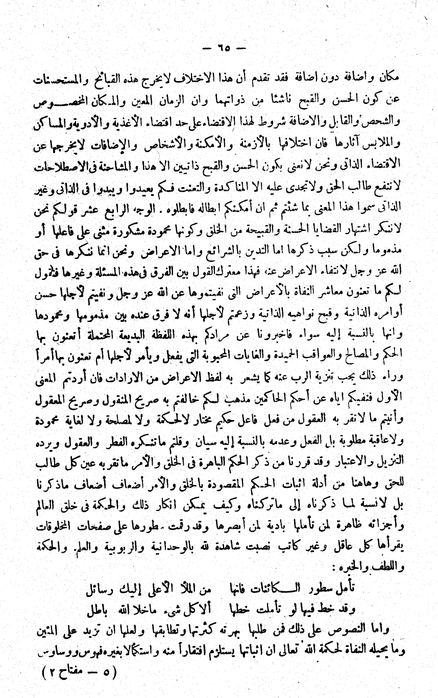 مَكَان وَإِضَافَة دون إِضَافَة فقد تقدم أَن هَذَا الِاخْتِلَاف لَا يخرج هَذِه القبائح والمستحسنات عَن كَون الْحسن والقبح ناشئا من ذواتهما وَأَن الزَّمَان الْمعِين وَالْمَكَان الْمَخْصُوص والشخص والقابل وَالْإِضَافَة شُرُوط لهَذَا الِاقْتِضَاء على حد اقْتِضَاء الأغذية والأدوية والمساكن والملابس آثارها فَإِن اختلافها بالأزمنة والأمكنة والأشخاص والإضافات لَا يُخرجهَا عَن الِاقْتِضَاء الذاتي وَنحن لَا نعنى بِكَوْن الْحسن والقبح ذاتيين إِلَّا هَذَا والمشاحنة فِي الاصطلاحات لَا تنقع طَالب الْحق وَلَا تجدي عَلَيْهِ إِلَّا المناكدة والتعنت فكم يُعِيدُوا ويبدوا فِي الذاتي وَغير الذاتي سموا هَذَا الْمَعْنى بِمَا شِئْتُم ثمَّ أَن أمكنكم إِبْطَاله فأبطلوه