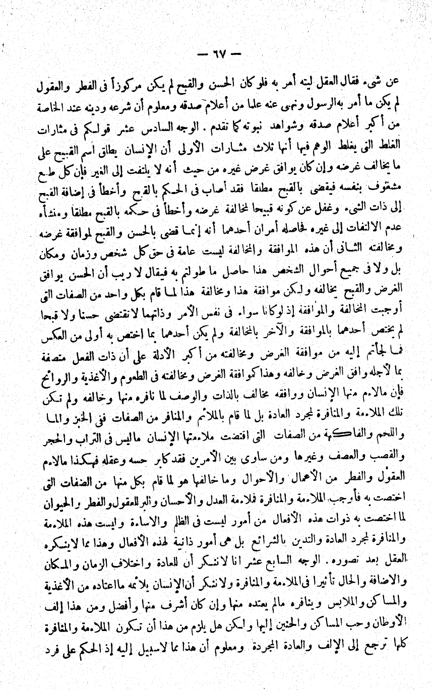 الْوَجْه السَّابِع عشر أَنا لَا ننكر أَن للْعَادَة وَاخْتِلَاف الزَّمَان وَالْمَكَان وَالْإِضَافَة وَالْحَال تَأْثِيرا فِي الملاءمة والمنافرة وَلَا ننكر أَن الْإِنْسَان يلائمه مَا اعتاده من الأغذية والمساكن والملابس وينافره مَا لم يعتده مِنْهَا وان كَانَ أشرف مِنْهَا وَأفضل وَمن هَذَا إلْف الأوطان وَحب المساكن والحنين إِلَيْهَا وَلَكِن هَل يلْزم من هَذَا أَن تكون الملاءمة والمنافرة كلهَا ترجع إِلَى الالف وَالْعَادَة الْمُجَرَّدَة وَمَعْلُوم أَن هَذَا مِمَّا لَا سَبِيل إِلَيْهِ إِذْ الحكم على فَرد