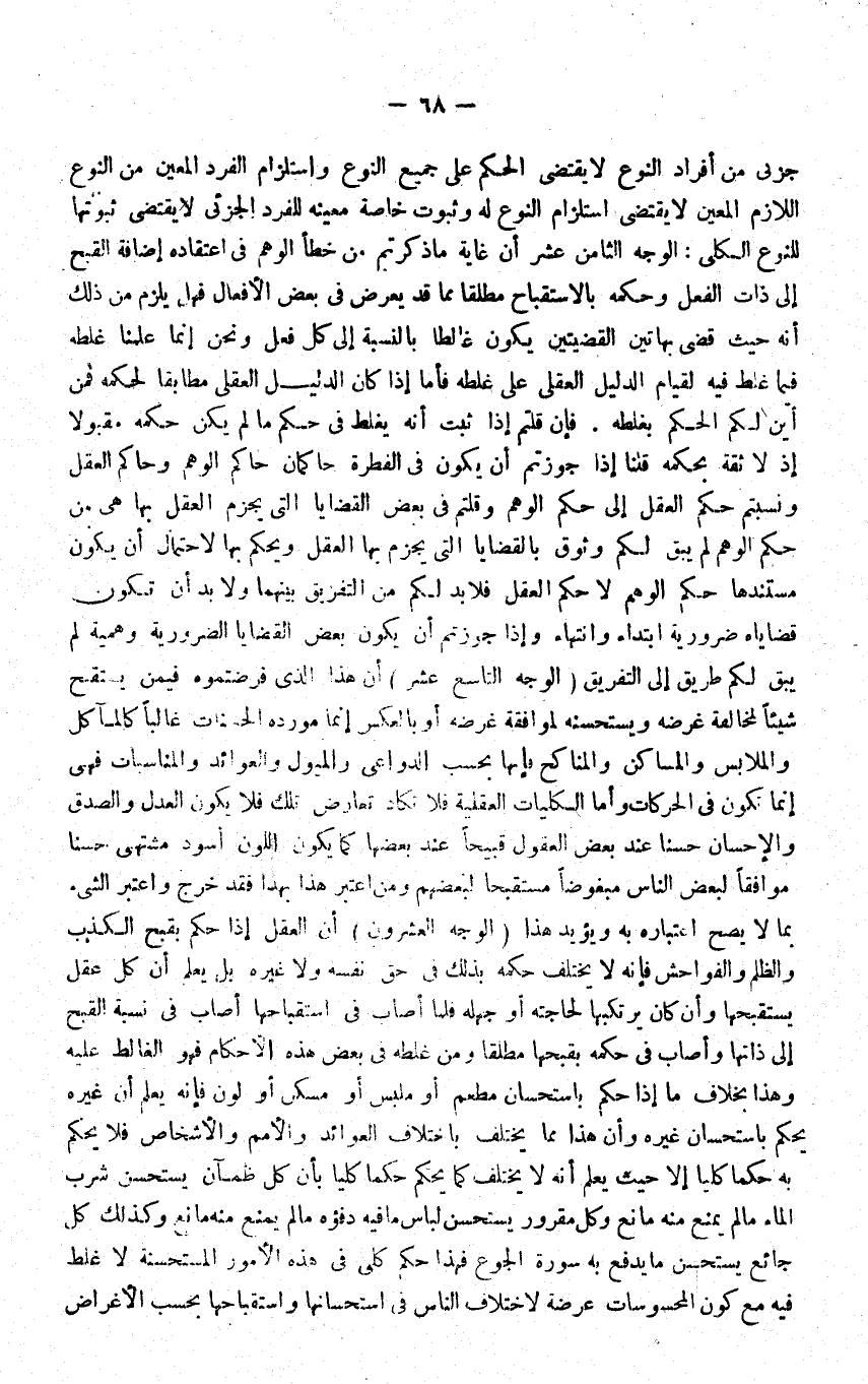 الْوَجْه الثَّامِن عشر أَن غَايَة مَا ذكرْتُمْ من خطأ الْوَهم فِي اعْتِقَاده إِضَافَة الْقبْح إِلَى ذَات الْفِعْل وَحكمه بالاستقباح مُطلقًا مِمَّا قد يعرض فِي بعض الْأَفْعَال فَهَل يلْزم من ذَلِك أَنه حَيْثُ قضى بِهَاتَيْنِ القضيتين يكون غالطا بِالنِّسْبَةِ إِلَى كل فعل وَنحن إِنَّمَا علمنَا غلطه فِيمَا غلط فِيهِ لقِيَام الدَّلِيل الْعقلِيّ على غلطه فَأَما إِذا كَانَ الدَّلِيل الْعقلِيّ مطابقا لحكمه فَمن أَيْن لكم الحكم بغلطه