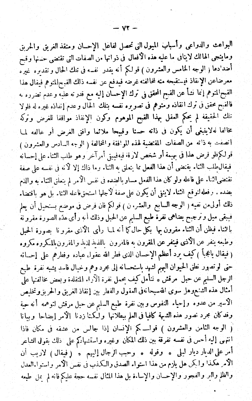 الْوَجْه الْخَامِس وَالْعشْرُونَ قَوْلكُم أَنه يقدر نَفسه فِي تِلْكَ الْحَال وَتَقْدِيره غَيره معرضًا عَن الانقاذ فيستقبحه مِنْهُ لمُخَالفَته غَرَضه فَيدْفَع عَن نَفسه ذَلِك الْقبْح المتوهم فَيُقَال هَذَا الْقبْح المتوهم إِنَّمَا نَشأ عَن الْقبْح الْمُحَقق فِي ترك الْإِحْسَان إِلَيْهِ مَعَ قدرته عَلَيْهِ وَعدم تضرره بِهِ فالقبح مُحَقّق فِي ترك إنقاذه ومتوهم فِي تَصْوِيره نَفسه بِتِلْكَ الْحَال وَعدم إنقاذه غَيره لَهُ فلولا تِلْكَ الْحَقِيقَة لم يحكم الْعقل بِهَذَا الْقبْح الموهوم وَكَون الانقاذ مُوَافقا للغرض وَتَركه مُخَالفا لَهُ لَا يَنْبَغِي أَن يكون فِي ذَاته حسنا وقبيحا ملائما وَافق الْغَرَض أَو خَالفه لما اتصفت بِهِ ذَاته من الصِّفَات الْمُقْتَضِيَة لهَذِهِ الْمُوَافقَة والمخالفة الْوَجْه السَّادِس وَالْعشْرُونَ قَوْلكُم فَلَو فرض هَذَا فِي بَهِيمَة أَو شخص لارقة فِيهِ فَيبقى أَمر آخر وَهُوَ طلب الثَّنَاء على إحسانه فَيُقَال طلب الثَّنَاء يَقْتَضِي أَن هَذَا الْفِعْل مِمَّا يتَعَلَّق بِهِ الثَّنَاء وَمَا ذَاك أَلا لِأَنَّهُ فِي نَفسه على صفة تَقْتَضِي الثَّنَاء على فَاعله وَلَو كَانَ هَذَا الْفِعْل مُسَاوِيا لضده فِي نفس الْأَمر لم يتَعَلَّق الثَّنَاء بِهِ والذم بضده وَفعله لتوقع الثَّنَاء لَا ينفى أَن يكون على صفة لأَجلهَا اسْتحق فَاعله الثَّنَاء بل هُوَ باقتضاء ذَلِك أولى من نَفْيه