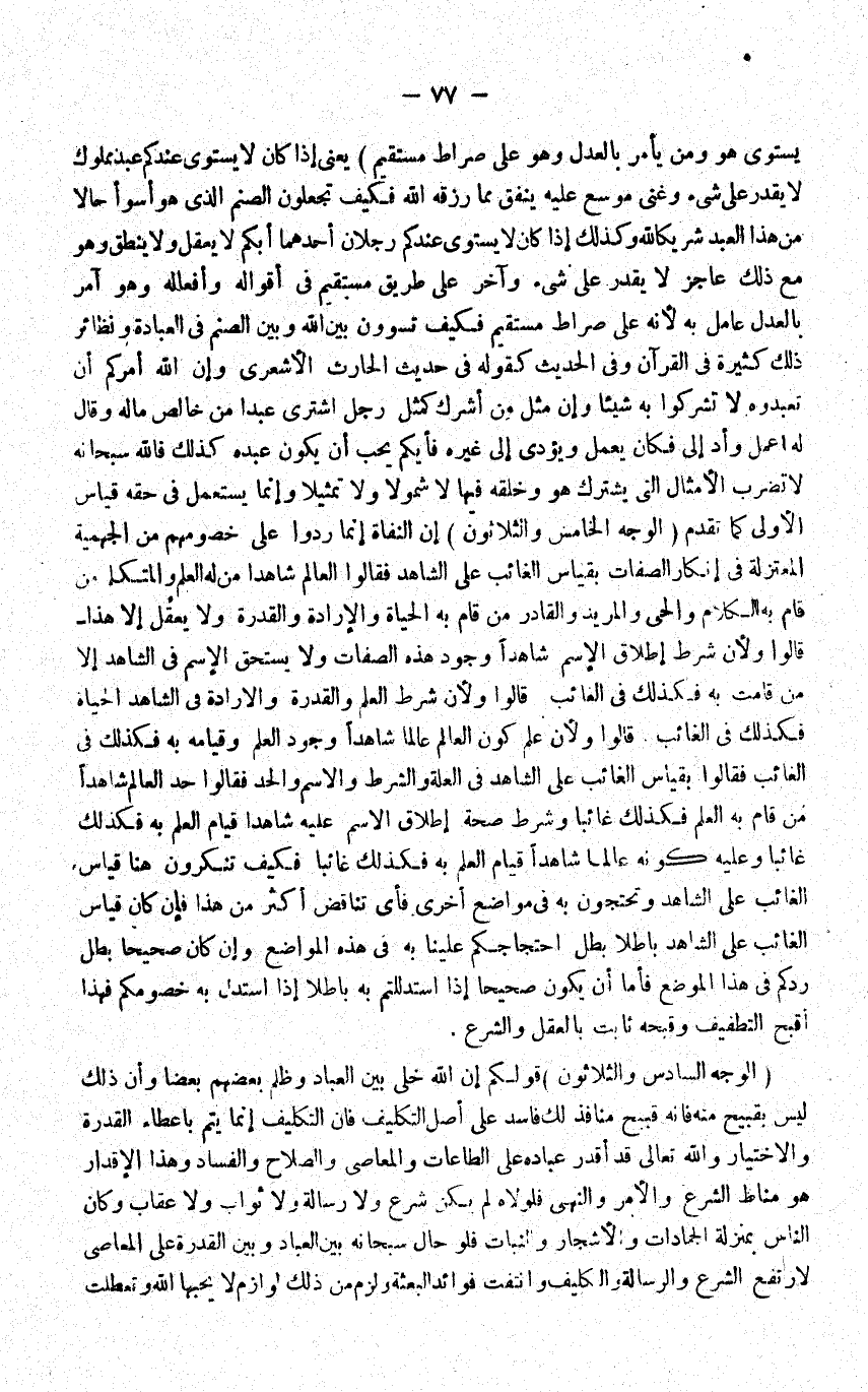 الْوَجْه السَّادِس وَالثَّلَاثُونَ قَوْلكُم أَن الله خلى بَين الْعباد وظلم بَعضهم بَعْضًا وَأَن ذَلِك لَيْسَ بقبيح مِنْهُ فانه قَبِيح منا فَذَلِك فَاسد على أصل التَّكْلِيف فان التَّكْلِيف إِنَّمَا يتم بِإِعْطَاء الْقُدْرَة وَالِاخْتِيَار وَالله تَعَالَى قد أقدر عباده على الطَّاعَات والمعاصي وَالصَّلَاح وَالْفساد وَهَذَا الأقدار هُوَ منَاط الشَّرْع وَالْأَمر وَالنَّهْي فلولاه لم يكن شرع وَلَا رِسَالَة وَلَا ثَوَاب وَلَا عِقَاب وَكَانَ النَّاس بِمَنْزِلَة الجمادات وَالْأَشْجَار والنبات فَلَو حَال سُبْحَانَهُ بَين الْعباد وَبَين الْقُدْرَة على الْمعاصِي لارتفع الشَّرْع والرسالة والتكليف وانتفت فَوَائِد الْبعْثَة وَلزِمَ من ذَلِك لَوَازِم لَا يُحِبهَا الله وتعطلت