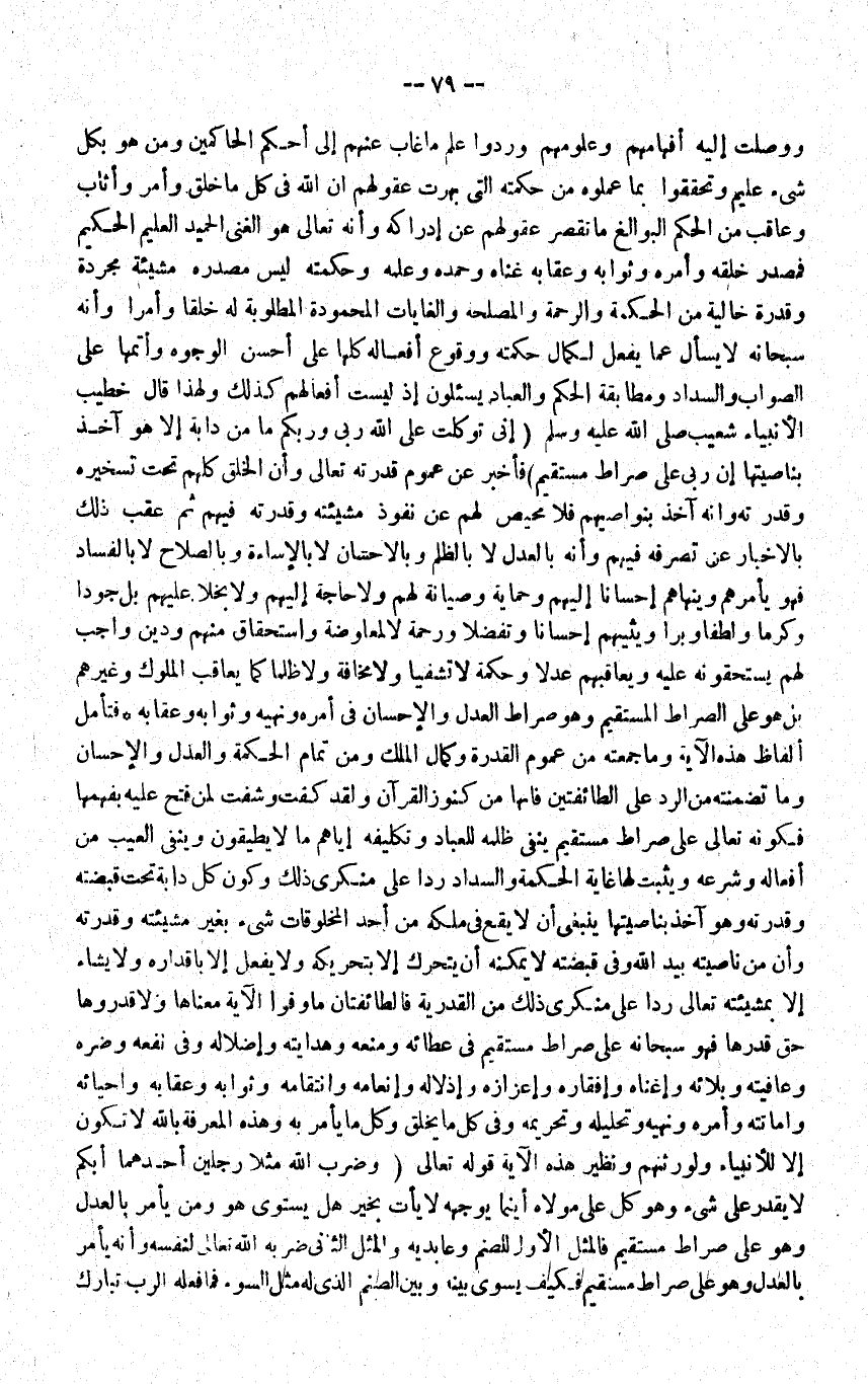 ووصلت إِلَيْهِ إفهامهم وعلومهم وردوا علم مَا غَابَ عَنْهُم إِلَى أحكم الْحَاكِمين وَمن هُوَ بِكُل شَيْء عليم وتحققوا بِمَا عملوه من حكمته الَّتِي بهرت عُقُولهمْ أَن الله فِي كل مَا خلق وَأمر وأثاب وعاقب من الحكم البوالغ مَا تقصر عُقُولهمْ عَن إِدْرَاكه وَأَنه تَعَالَى هُوَ الْغَنِيّ الحميد الْعَلِيم الْحَكِيم فمصدر خلقه وَأمره وثوابه وعقابه غناهُ وحمده وَعلمه وحكمته لَيْسَ مصدره مَشِيئَة مُجَرّدَة وقدرة خَالِيَة من الْحِكْمَة وَالرَّحْمَة والمصلحة والغايات المحمودة الْمَطْلُوبَة لَهُ خلقا وأمرا وَأَنه سُبْحَانَهُ لَا يسْأَل عَمَّا يفعل لكَمَال حكمته وَوُقُوع أَفعاله كلهَا على أحسن الْوُجُوه وأتمها على الصَّوَاب والسداد ومطابقة الحكم والعباد يسْأَلُون إِذْ لَيست أفعالهم كَذَلِك وَلِهَذَا قَالَ خطيب الْأَنْبِيَاء شُعَيْب عَلَيْهِ السَّلَام أَنى توكلت على الله رَبِّي وربكم مَا من دَابَّة إِلَّا هُوَ آخذ بناصيتها أَن رَبِّي على صِرَاط مُسْتَقِيم فَأخْبر عَن عُمُوم قدرته تَعَالَى وَأَن الْخلق كلهم تَحت تسخيره وَقدرته وانه آخذ بنواصيهم فَلَا محيص لَهُم عَن نُفُوذ مَشِيئَته وَقدرته فيهم ثمَّ عقب ذَلِك بالأخبار عَن تصرفه فيهم وَأَنه بِالْعَدْلِ لَا بالظلم وبالإحسان لَا بالإساءة وبالصلاح لَا بِالْفَسَادِ فَهُوَ يَأْمُرهُم وينهاهم إحسانا إِلَيْهِم وحماية وصيانة لَهُم وَلَا حَاجَة إِلَيْهِم وَلَا بخلا عَلَيْهِم بل جودا وكرما ولطفا وَبرا ويثيبهم إحسانا وتفضلا وَرَحْمَة لَا لمعاوضة وَاسْتِحْقَاق مِنْهُم وَدين وَاجِب لَهُم يستحقونه عَلَيْهِ ويعاقبهم عدلا وَحِكْمَة لَا تشفيا وَلَا مَخَافَة وَلَا ظلما كَمَا يُعَاقب الْمُلُوك وَغَيرهم بل هُوَ على الصِّرَاط الْمُسْتَقيم وَهُوَ صِرَاط الْعدْل وَالْإِحْسَان فِي أمره وَنَهْيه وثوابه وعقابه فَتَأمل أَلْفَاظ هَذِه الْآيَة وَمَا جمعته من عُمُوم الْقُدْرَة وَكَمَال الْملك وَمن تَمام الْحِكْمَة وَالْعدْل وَالْإِحْسَان وَمَا تضمنته من الرَّد على الطَّائِفَتَيْنِ فَأَنَّهَا من كنوز الْقُرْآن وَلَقَد كفت وشفت لمن فتح عَلَيْهِ بفهمها فكونه تَعَالَى على صِرَاط مُسْتَقِيم ينفى ظلمه للعباد وتكليفه إيَّاهُم مَا لَا يُطِيقُونَ وينفى الْعَيْب من أَفعاله وشرعه وَيثبت لَهَا غَايَة الْحِكْمَة والسداد ردا على منكري ذَلِك وَكَون كل دَابَّة تَحت قَبضته وَقدرته وَهُوَ آخذ بناصيتها يَنْبَغِي أَن لَا يَقع فِي ملكه من أحد الْمَخْلُوقَات شَيْء بِغَيْر مَشِيئَته وَقدرته وَأَن من ناصيته بيد الله وَفِي قَبضته لَا يُمكنهُ أَن يَتَحَرَّك إِلَّا بتحريكه وَلَا يفعل إِلَّا بأقداره وَلَا يَشَاء إِلَّا بمشيئته تَعَالَى ردا على منكري ذَلِك من الْقَدَرِيَّة فالطائفتان مَا وفوا الْآيَة مَعْنَاهَا وَلَا قدروها حق قدرهَا فَهُوَ سُبْحَانَهُ على صِرَاط مُسْتَقِيم فِي عطائه وَمنعه وهدايته واضلاله وَفِي نَفعه وضره وعافيته وبلائه واغناه وإفقاره وإعزازه وإذلاله وانعامه وانتقامه وثوابه وعقابه وإحيائه وإماتته وَأمره وَنَهْيه وتحليله وتحريمه وَفِي كل مَا يخلق وكل مَا يَأْمر بِهِ وَهَذِه الْمعرفَة بِاللَّه لَا تكون إِلَّا للأنبياء ولورثتهم وَنَظِير هَذِه الْآيَة قَوْله تَعَالَى وَضرب الله مثلا رجلَيْنِ أَحدهمَا أبكم لَا يقدر على شَيْء وَهُوَ كل على مَوْلَاهُ أَيْنَمَا يوجهه لايأت بِخَير هَل يَسْتَوِي هُوَ وَمن يَأْمر بِالْعَدْلِ وَهُوَ على صِرَاط مُسْتَقِيم فالمثل الأول للضم وعابديه والمثل الثَّانِي ضربه الله تَعَالَى لنَفسِهِ وَأَنه يَأْمر بِالْعَدْلِ وَهُوَ على صِرَاط مُسْتَقِيم فَكيف يسوى بَينه وَبَين الصَّنَم الَّذِي لَهُ مثل السوء فَمَا فعله الرب تبَارك