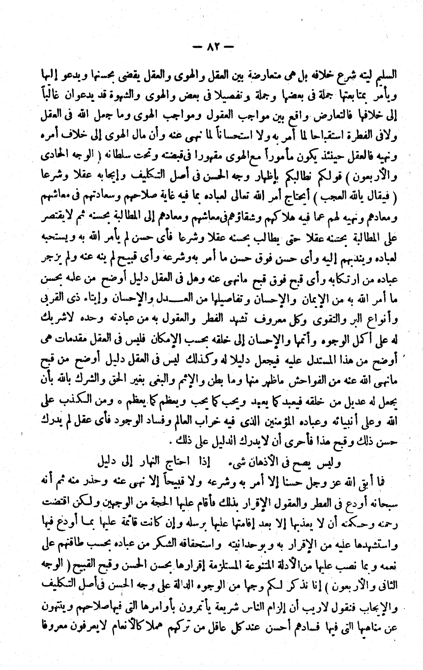 الْوَجْه الْحَادِي وَالْأَرْبَعُونَ قَوْلكُم نطالبكم بِإِظْهَار وَجه الْحسن فِي أصل التَّكْلِيف وايجابه عقلا وَشرعا فَيُقَال يالله الْعجب أيحتاج أَمر الله تَعَالَى لِعِبَادِهِ بِمَا فِيهِ غَايَة صَلَاحهمْ وسعادتهم فِي معاشهم ومعادهم وَنَهْيه لَهُم عَمَّا فِيهِ هلاكهم وشقاؤهم فِي معاشهم ومعادهم إِلَى الْمُطَالبَة بحسنه ثمَّ لَا يقْتَصر على الْمُطَالبَة بحسنه عقلا حَتَّى يُطَالب بحسنه عقلا وَشرعا فَأَي حسن لم يَأْمر الله بِهِ ويستحبه لِعِبَادِهِ ويندبهم إِلَيْهِ وَأي حسن فَوق حسن مَا أَمر بِهِ وشرعه وَأي قَبِيح لم ينْه عَنهُ وَلم يزْجر عباده من ارتكابه وَأي قبح فَوق قبح مَا نهى عَنهُ وَهل فِي الْعقل دَلِيل أوضح من علمه بِحسن مَا أَمر الله بِهِ من الْأَيْمَان وَالْإِحْسَان وتفاصيلها من الْعدْل وَالْإِحْسَان وإيتاء ذِي الْقُرْبَى وأنواع الْبر وَالتَّقوى وكل مَعْرُوف تشهد الْفطر والعقول بِهِ من عِبَادَته وَحده لَا شريك لَهُ على أكمل الْوُجُوه وأتمها وَالْإِحْسَان إِلَى خلقه بِحَسب الْإِمْكَان فَلَيْسَ فِي الْعقل مُقَدمَات هِيَ أوضح من هَذَا الْمُسْتَدلّ عَلَيْهِ فَيجْعَل دَلِيلا لَهُ وَكَذَلِكَ لَيْسَ فِي الْعقل دَلِيل أوضح من قبح مَا نهى الله عَنهُ من الْفَوَاحِش مَا ظهر مِنْهَا وَمَا بطن والاثم وَالْبَغي بِغَيْر الْحق والشرك بِاللَّه بِأَن يَجْعَل لَهُ عديل من خلقه فيعبد كَمَا يعبد وَيُحب كَمَا يحب ويعظم كَمَا يعظم وَمن الْكَذِب على الله وعَلى أنبيائه وعباده الْمُؤمنِينَ الَّذِي فِيهِ خراب الْعَالم وَفَسَاد الْوُجُود فَأَي عقل لم يدْرك حسن ذَلِك وقبح هَذَا فأحرى أَن لَا يدْرك الدَّلِيل على ذَلِك