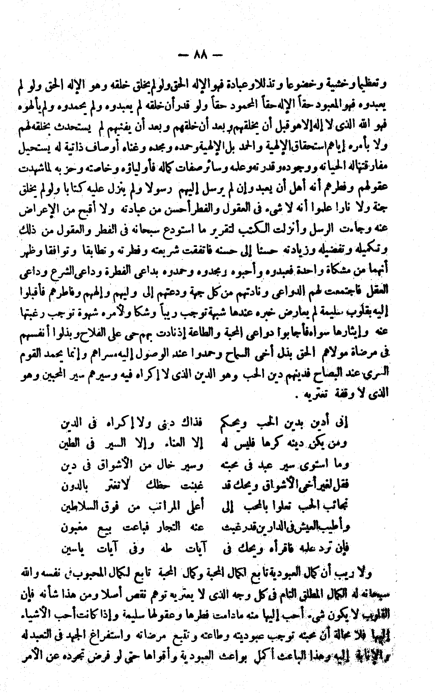 وتعظيما وخشية وخضوعا وتذللا وَعبادَة فَهُوَ الْإِلَه الْحق وَلَو لم يخلق خلقه وَهُوَ الْإِلَه الْحق وَلَو لم يعبدوه فَهُوَ المعبود حَقًا إِلَّا لَهُ حَقًا الْمَحْمُود حَقًا وَلَو قدر أَن خلقه لم يعبدوه وَلم يحمدوه وَلم يألهوه فَهُوَ الله الَّذِي لَا اله إِلَّا هُوَ قبل أَن يخلقهم وَبعد أَن خلقهمْ وَبعد أَن يغنيهم لم يستحدث بخلقه لَهُم وَلَا بأَمْره إيَّاهُم اسْتِحْقَاق الإلهية وَالْحَمْد بل الإلهية وحمده ومجده وغناه أَوْصَاف ذاتية لَهُ يَسْتَحِيل مفارقتها لَهُ لِحَيَاتِهِ ووجوده وَقدرته وَعلمه وَسَائِر صِفَات كَمَاله فأولياؤه وخاصته وَحزبه لما شهِدت عُقُولهمْ وفطرهم أَنه أهل أَن يعبد وان لم يُرْسل إِلَيْهِم رَسُولا وَلم ينزل عَلَيْهِ كتابا وَلَو لم يخلق جنَّة وَلَا نَارا علمُوا أَنه لَا شَيْء فِي الْعُقُول وَالْفطر أحسن من عِبَادَته وَلَا أقبح من الْأَعْرَاض عَنهُ وَجَاءَت الرُّسُل وأنزلت الْكتب لتقرير مَا استودع سُبْحَانَهُ فِي الْفطر والعقول من ذَلِك وتكميله وتفضيله وزيادته حسنا إِلَى حسنه فاتفقت شَرِيعَته وفطرته وتطابقا وتوافقا وَظهر أَنَّهُمَا من مشكاة وَاحِدَة فعبدوه وأحبوه ومجدوه وحمدوه بداعي الْفطْرَة وداعي الشَّرْع وداعي الْعقل فاجتمعت لَهُم الدَّوَاعِي ونادتهم من كل جِهَة ودعتهم إِلَى وليهم والههم وفاطرهم فَأَقْبَلُوا إِلَيْهِ بقلوب سليمَة لم يُعَارض خَبره عِنْدهَا شُبْهَة توجب ريبا وشكا ولأمره شَهْوَة توجب رغبتها عَنهُ وإيثارها سواهُ فَأَجَابُوا دواعي الْمحبَّة وَالطَّاعَة إِذْ نادت بهم حَيّ على الْفَلاح وبذلوا أنفسهم فِي مرضاة مَوْلَاهُم الْحق بذل أخي السماح وحمدوا عِنْد الْوُصُول إِلَيْهِ مسراهم وانما يحمد الْقَوْم السرى عِنْد الصَّباح فدينهم دين الْحبّ وَهُوَ الدّين الَّذِي لَا إِكْرَاه فِيهِ وسيرهم سير المحبين وَهُوَ الَّذِي لَا وَقْفَة تعتريه