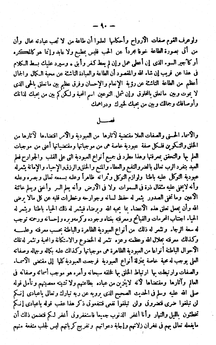 وَالْأَمر اقتضاءها لآثارها من الْخلق والتكوين فَلِكُل صفة عبودية خَاصَّة هِيَ من موجباتها ومقتضياتها أعنى من مُوجبَات الْعلم بهَا والتحقق بمعرفتها وَهَذَا مطرد فِي جَمِيع أَنْوَاع الْعُبُودِيَّة الَّتِي على الْقلب والجوارح فَعلم العَبْد بتفرد الرب تَعَالَى بالضر والنفع وَالعطَاء وَالْمَنْع والخلق والرزق والإحياء والإماتة يُثمر لَهُ عبودية التَّوَكُّل عَلَيْهِ بَاطِنا ولوازم التَّوَكُّل وثمراته ظَاهرا وَعلمه بسمعه تَعَالَى وبصره وَعلمه وَأَنه لَا يخفى عَلَيْهِ مِثْقَال ذرة فِي السَّمَوَات وَلَا فِي الأَرْض وَأَنه يعلم السِّرّ وأخفى وَيعلم خَائِنَة الْأَعْين وَمَا تخفى الصُّدُور يُثمر لَهُ حفظ لِسَانه وجوارحه وخطرات قلبه عَن كل مَالا يرضى الله وَأَن يَجْعَل تعلق هَذِه الْأَعْضَاء بِمَا يُحِبهُ الله ويرضاه فيثمر لَهُ ذَلِك الْحيَاء بَاطِنا ويثمر لَهُ الْحيَاء اجْتِنَاب الْمُحرمَات والقبائح ومعرفته بغناه وجوده وَكَرمه وبره وإحسانه وَرَحمته توجب لَهُ سَعَة الرَّجَاء وتثمر لَهُ ذَلِك من أَنْوَاع الْعُبُودِيَّة الظَّاهِرَة والباطنة بِحَسب مَعْرفَته وَعلمه وَكَذَلِكَ مَعْرفَته بِجلَال الله وعظمته وعزه تثمر لَهُ الخضوع والاستكانة والمحبة وتثمر لَهُ تِلْكَ الْأَحْوَال الْبَاطِنَة أنواعا من الْعُبُودِيَّة الظَّاهِرَة هِيَ موجباتها وَكَذَلِكَ علمه بِكَمَالِهِ وجماله وَصِفَاته العلى يُوجب لَهُ محبَّة خَاصَّة بِمَنْزِلَة أَنْوَاع الْعُبُودِيَّة فَرَجَعت الْعُبُودِيَّة كلهَا إِلَى مُقْتَضى الْأَسْمَاء وَالصِّفَات وارتبطت بهَا ارتباط الْخلق بهَا فخلقه سُبْحَانَهُ وَأمره هُوَ مُوجب أَسْمَائِهِ وَصِفَاته فِي الْعَالم وآثارها ومقتضاها لِأَنَّهُ لَا يتزين من عباده بطاعتهم وَلَا تشينه معصيتهم وَتَأمل قَوْله فِي الحَدِيث الصَّحِيح الَّذِي يرويهِ عَن ربه تبَارك وَتَعَالَى يَا عبَادي أَنكُمْ لن تبلغوا ضرى فتضروني وَلنْ تبلغوا نفعي فتنفعوني ذكر هَذَا عقب قَوْله يَا عبَادي إِنَّكُم تخطئون بِاللَّيْلِ وَالنَّهَار وَأَنا أَغفر الذُّنُوب جَمِيعًا فاستغفروني أَغفر لكم فتضمن ذَلِك أَن مَا يَفْعَله تَعَالَى بهم فِي غفران زلاتهم وَإجَابَة دعواتهم وتفريج كرباتهم لَيْسَ لجلب مَنْفَعَة مِنْهُم