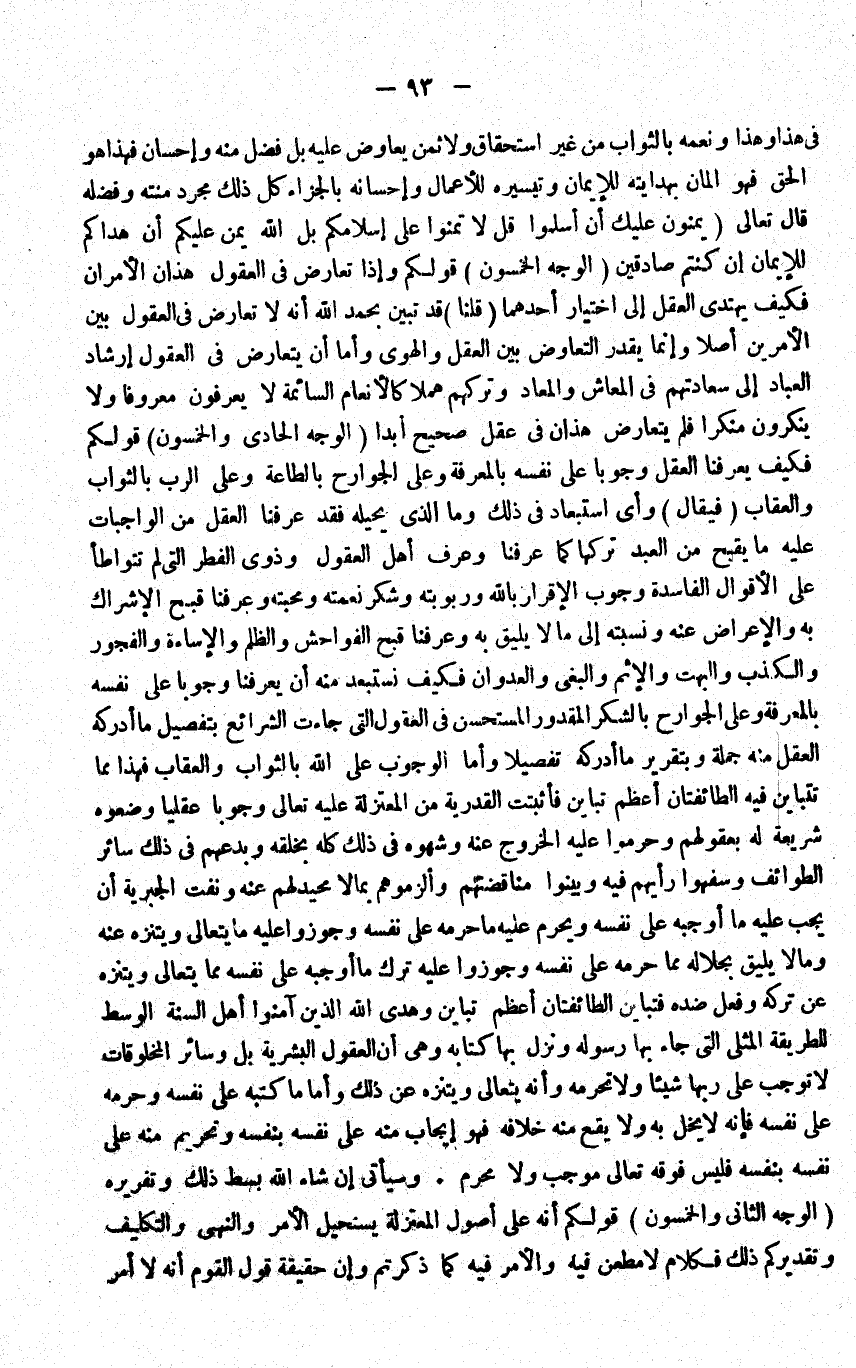 الْوَجْه الْخَمْسُونَ قَوْلكُم وَإِذا تعَارض فِي الْعُقُول هَذَانِ الْأَمْرَانِ فَكيف يَهْتَدِي الْعقل إِلَى اخْتِيَار أَحدهمَا قُلْنَا قد تبين بِحَمْد الله أَنه لَا تعَارض فِي الْعُقُول بَين الْأَمريْنِ أصلا وانما يقدر التَّعَارُض بَين الْعقل والهوى وَأما أَن يتعارض فِي الْعُقُول إرشاد الْعباد إِلَى سعادتهم فِي المعاش والمعاد وتركهم هملا كالأنعام السَّائِمَة لَا يعْرفُونَ مَعْرُوفا وَلَا يُنكرُونَ مُنْكرا فَلم يتعارض هَذَانِ فِي عقل صَحِيح أبدا